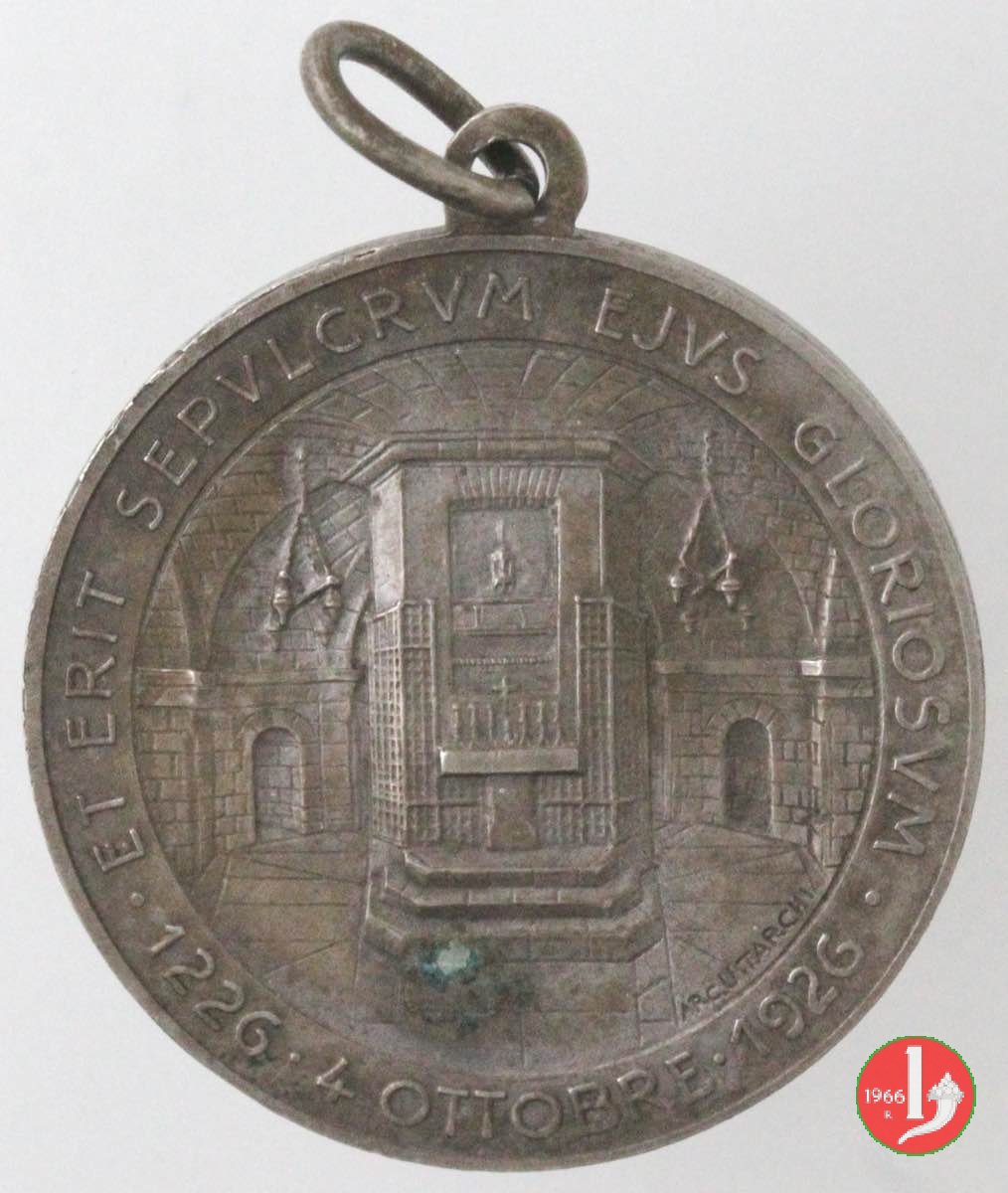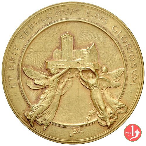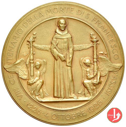 7° Centenario della morte 1926 Obverse: Angeli trasportano il corpo di San Francesco, sullo sfondo la Basilica d' Assisi sovrapposta a grande Croce in basso: VII CENTENARIO = DELLA MORTE DI SAN FRANCESCO = 1926 a sx, presso il bordo: F.M. LORIOLI & CASTELLI in esergo: LAVDATO SIE MI SIGNORE = CVM TVCTE LE TVE CREATVRE | |
