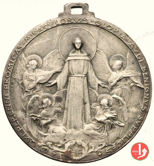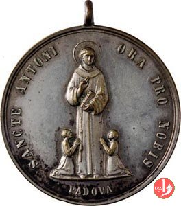 B. V. Domina Excelsa Super Sidera Obverse: SANCTE ANTONI _ ORA PRO NOBIS busto di Sant'Antonio nimbato, volto a sx con saio, regge il Bambino Gesú la B. V. in piedi di fronte su nubi e Cherubini, a capo raggiante | |