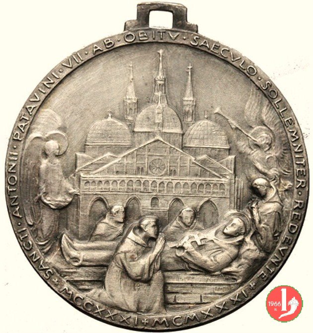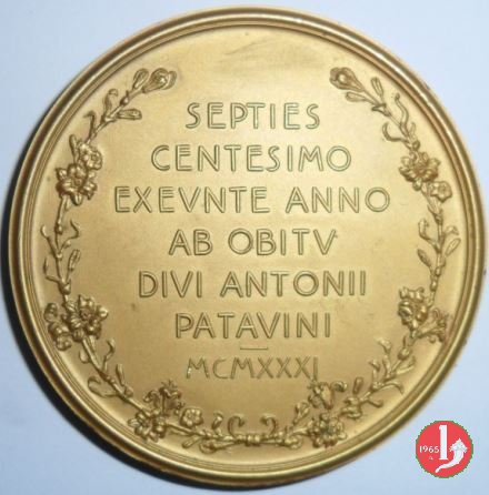 700° della Morte 1931 Obverse: ✠ O • QVI • PERENNI • PROMICAS • MIRACVLORVM • GLORIA • AVDI • BENIGNOS • SVPPLICES ✠ Sant'Antonio nimbato, con saio, in piedi, di fronte tra quattro angeli in basso: Stemma Crociato tra rami a sx, presso il bordo interno: LORIOLI a dx, presso il bordo interno: P. BOLDRIN a dx, monogramma: EM Prospetto anteriore della Basilica del Santo a Padova, in basso il corpo del Santo vegliato da tre frati ai lati: due angeli | |