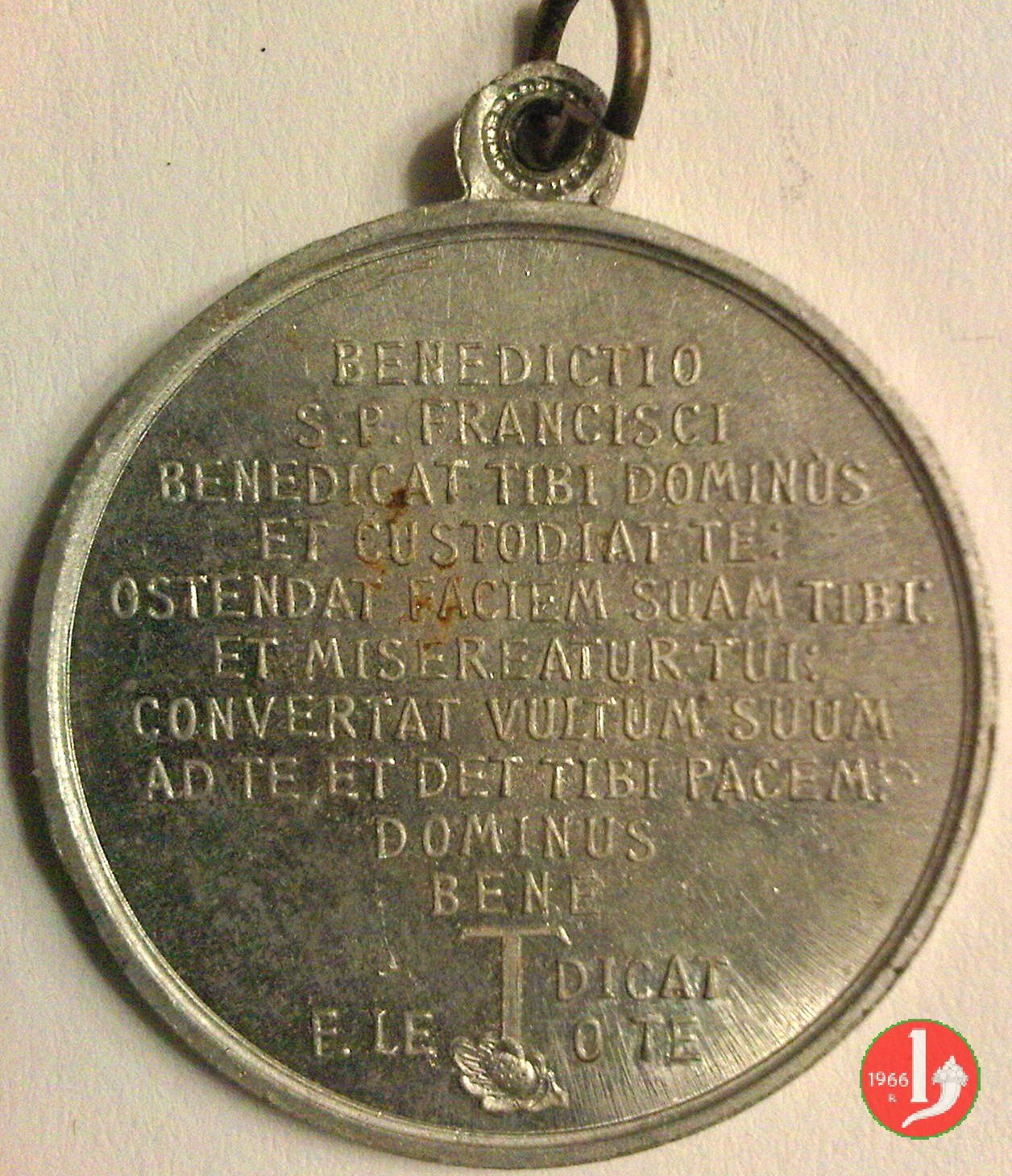 Benedizione di San Francesco a Frate Leone Obverse: S. FRANCISCVS _ ASSISIENSIS busto del Santo nimbato col saio a sx, volto a luce raggiante in basso, a dx: S.J. nel campo, sotto all'emblema del terz'Ordine Francescano (Braccia decussate su Croce raggiante) la Benedizione di San Francesco a frate Leone: BENEDICAT TIBI •... in basso T (Tau) | |