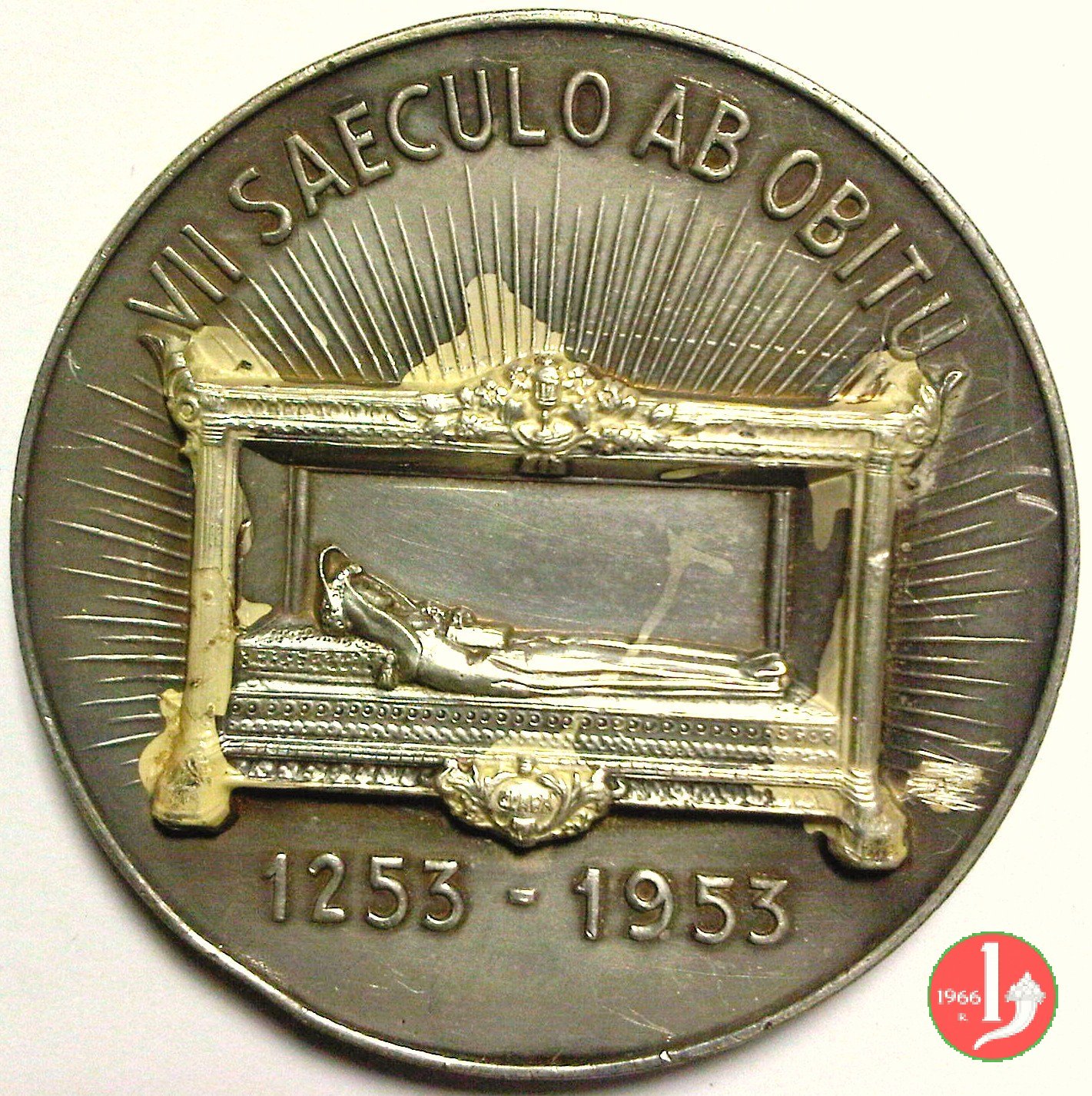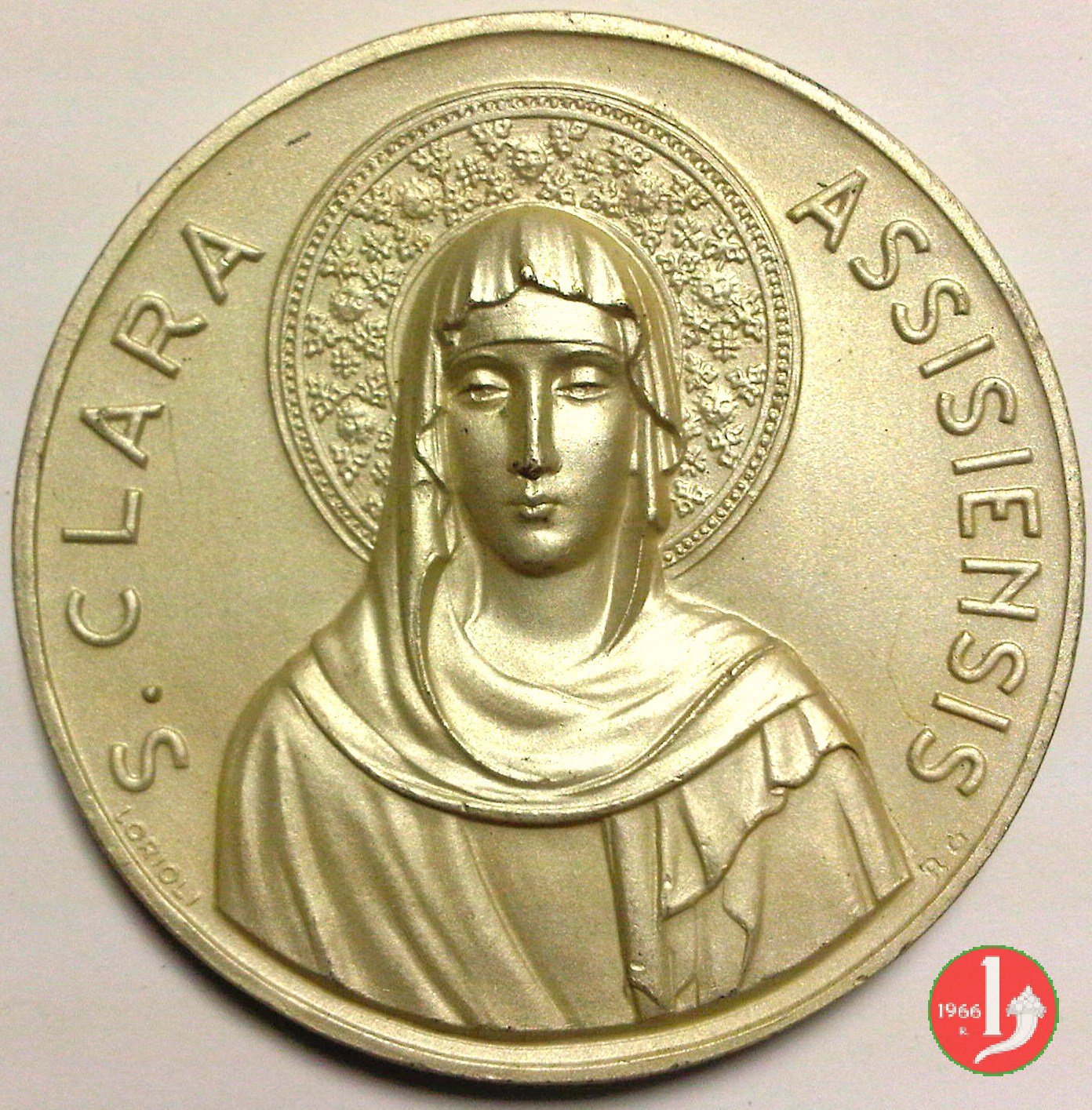 700° Ann. Morte di Santa Chiara 1953 Obverse: S. CLARA _ ASSISIENSIS busto nimbato di fronte in basso a sx: LORIOLI in basso a dx: RG Teca con il corpo della Santa raggiante sotto: 1253 - 1953 | |