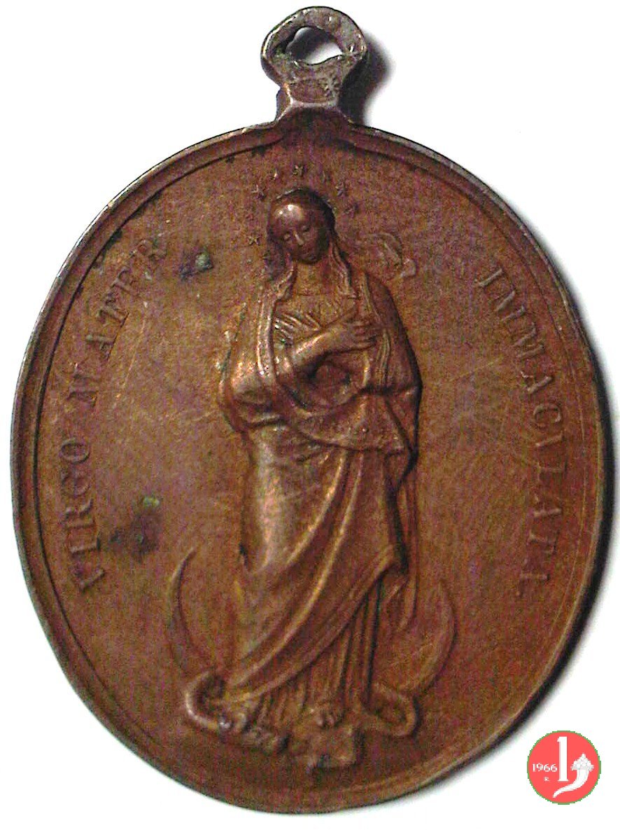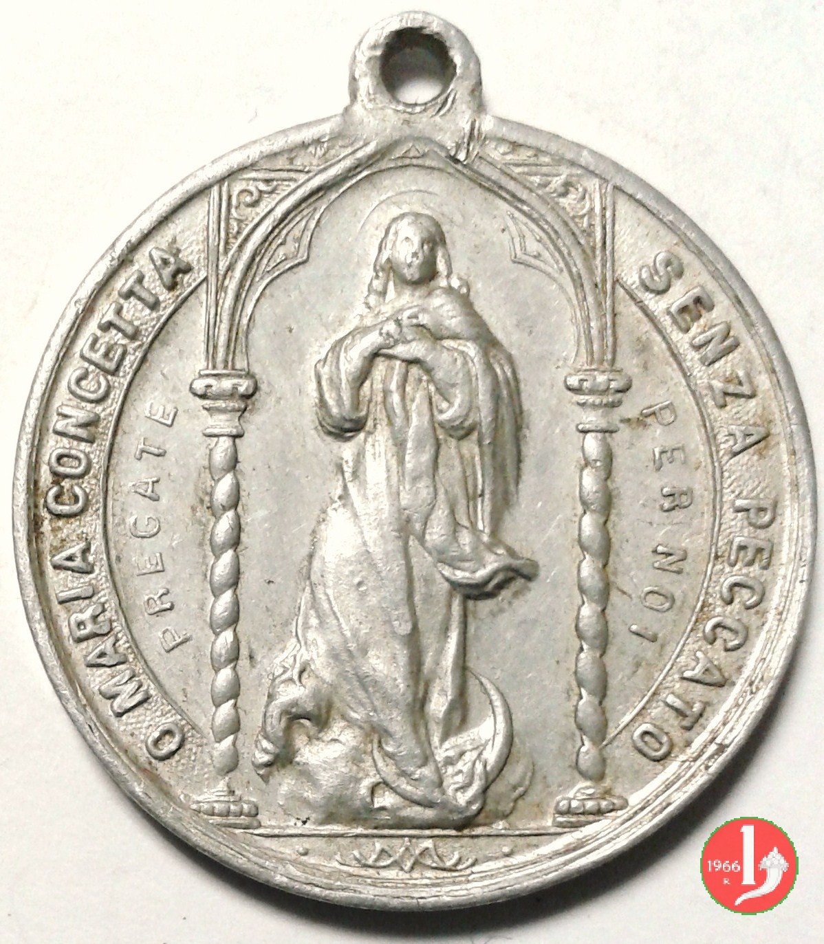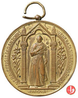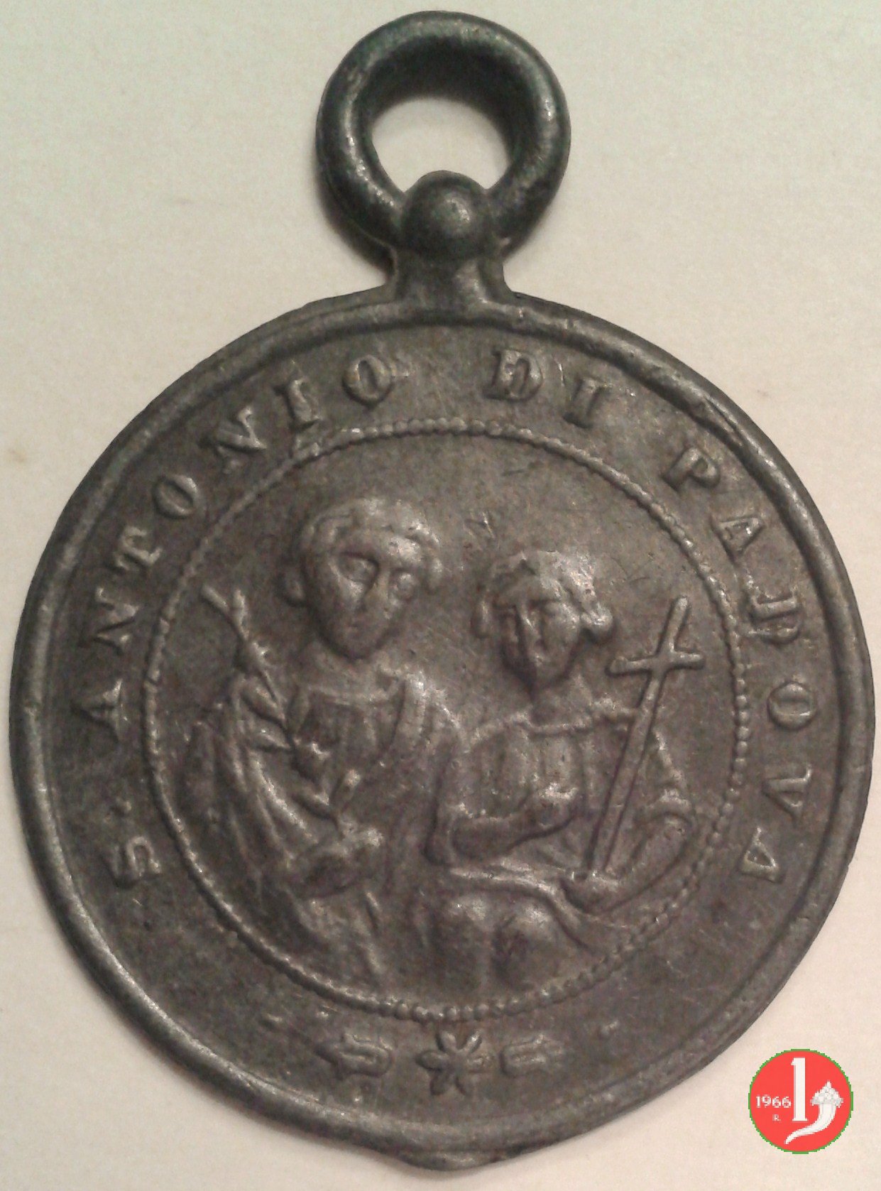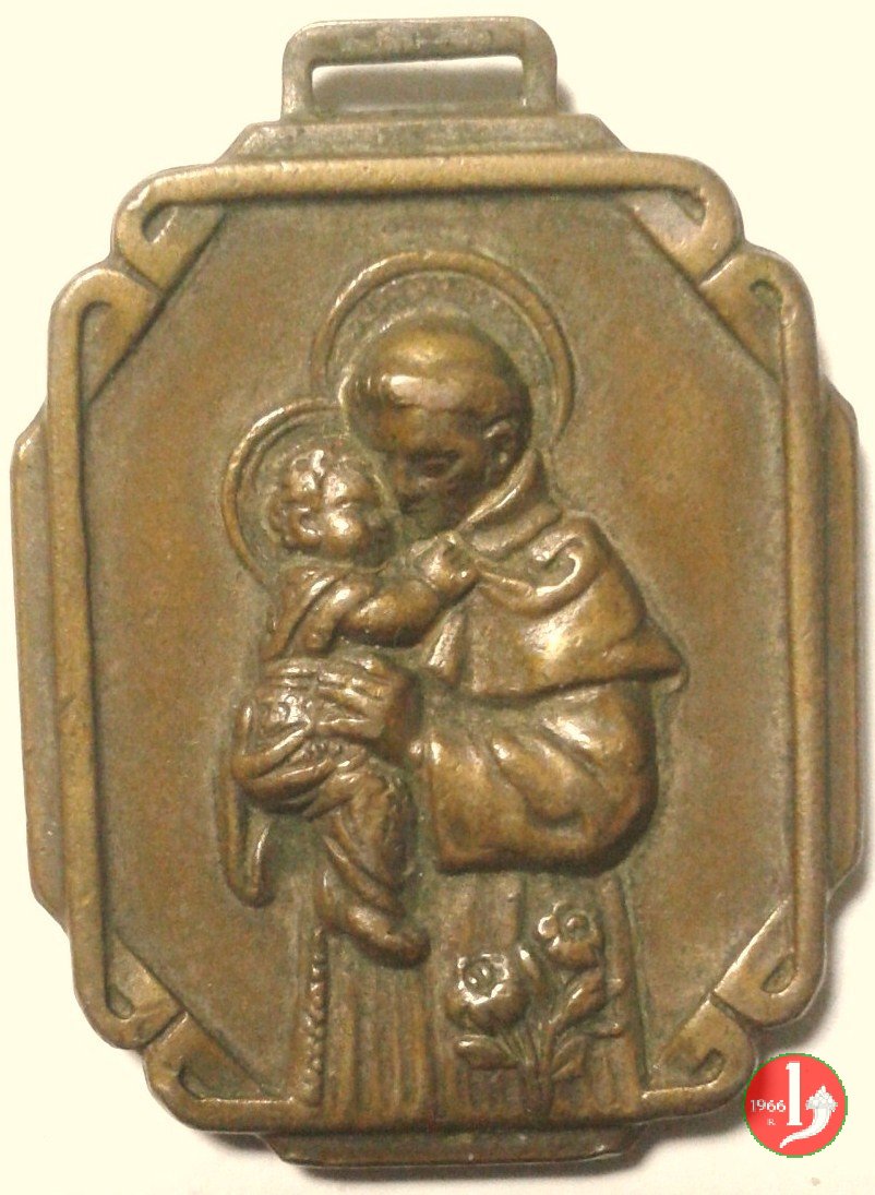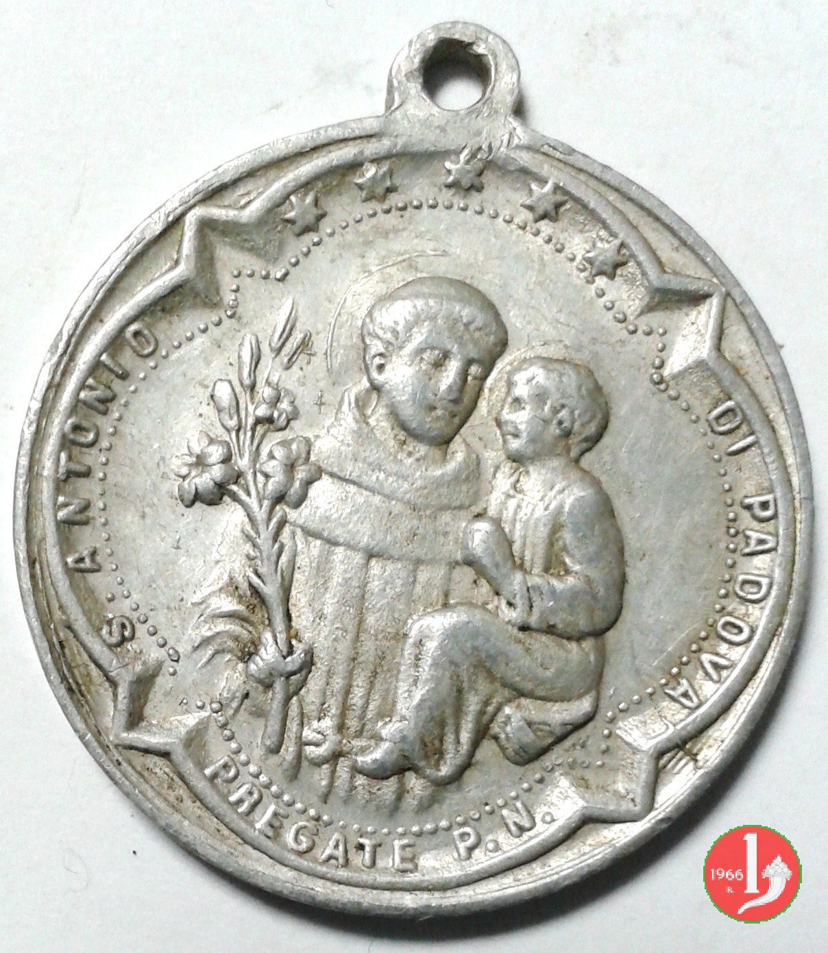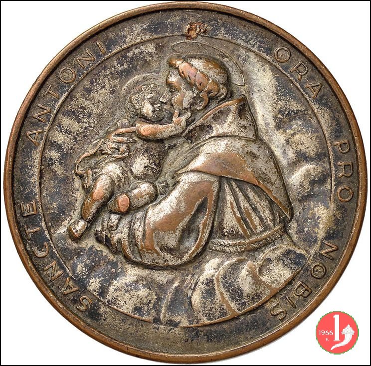 L'Immacolata 28mm Obverse: su cornice quadrilobata e cuspidata con perlinatura interna: S. ANTONIO _ DI PADOVA = PREGATE P.N. busto del Santo nimbato con saio regge Bambino Gesú e stelo di gigli all'interno del cerchio interno: PREGATE _ PER NOI entro nicchia con arco ogivale e colonne tortili: l'Immacolata in piedi di fronte in esergo: monogramma dell B. V. Maria | |