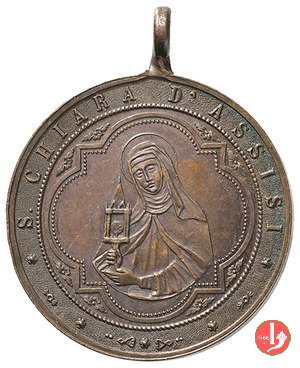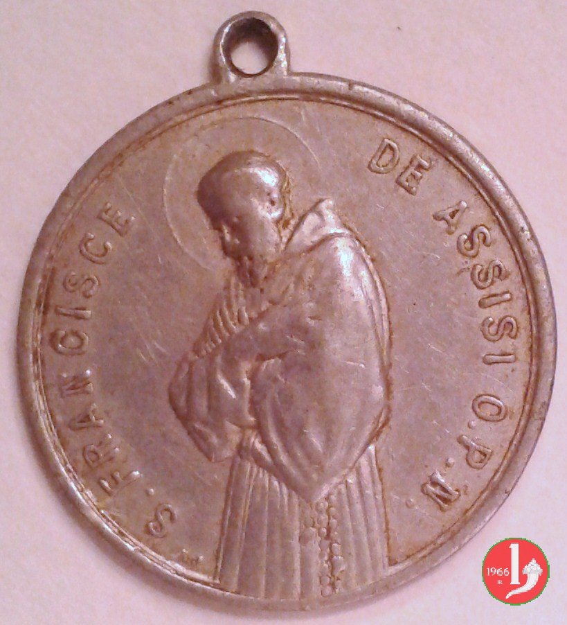 Francesco e Chiara d' Assisi 32mm Obverse: S. FRANCESCO D'ASSISI = - O.P.N. - entro cerchio perlinato e cornice quadrilobata e cuspidata perlinata internamente: busto nimbato di San Francesco di fronte con braccia incrociate sul petto entro cerchio perlinato e cornice quadrilobata e cuspidata perlinata internamente: busto di 3/4 a sx di Santa Chiara nimbata, velata e con abito talare, regge ostensorio | |