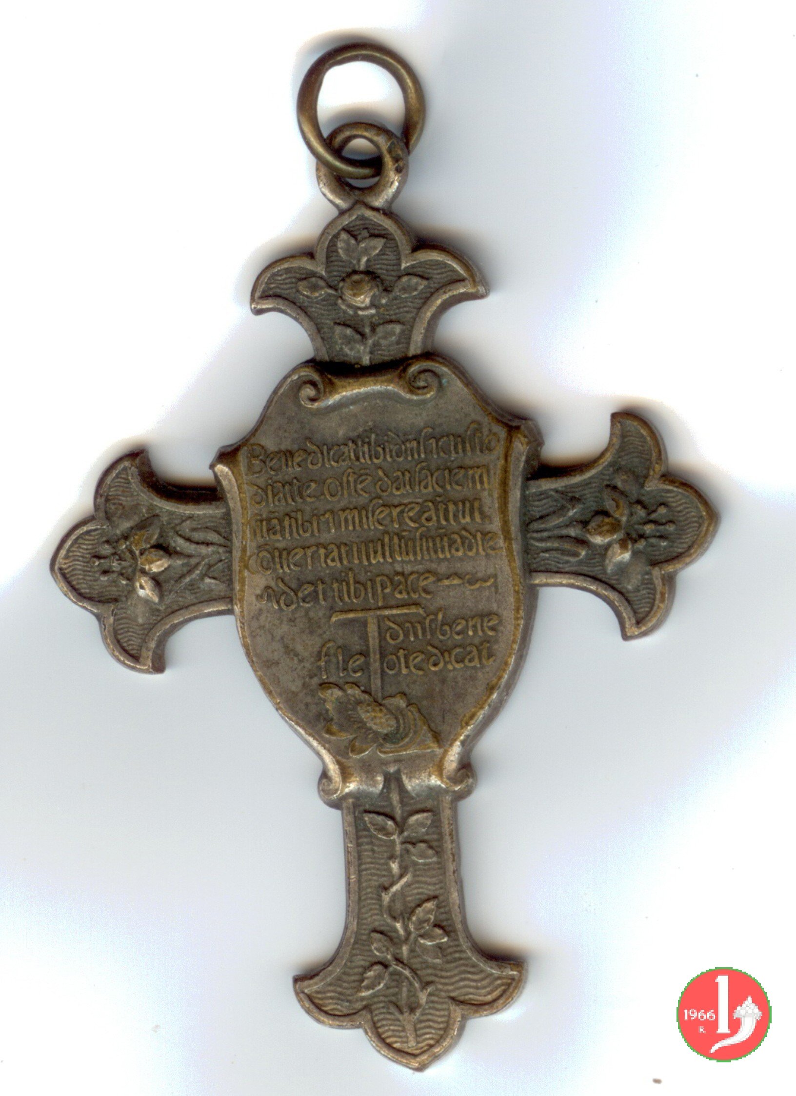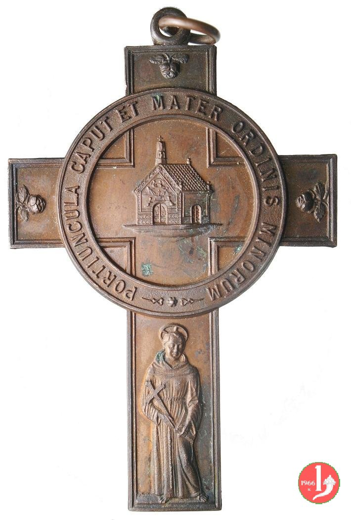 Croce del Terz'Ordine -TAM4172 Obverse: nel cerchio della medaglia: PORTIUNCULA CAPUT ET MATER ORDINIS MINORUM - • - al centro vista della Porziuncola sui bracci tre rose ed in basso San Francesco nimbato, in piedi, con saio, regge Croce in alto, circolarmente sulla medaglia: BENEDICTU S. P. FRANCISCI al centro: logo del Terz'Ordine Francescano sui bracci: ✠ BENEDICAT TIBI DOMINUS = ET CUSTODIAT TE: = ✠ OSTENDIAT FACIEM SUAM TIBI: = ET MISEREATUR TUI: = ✠ = CONVERTAT = VULTUM = SUUM = AD = TE = ET = DET = TIBI = PACEM = DOMINUS = BENE = Tau = F LE _ O TE = DICAT | |