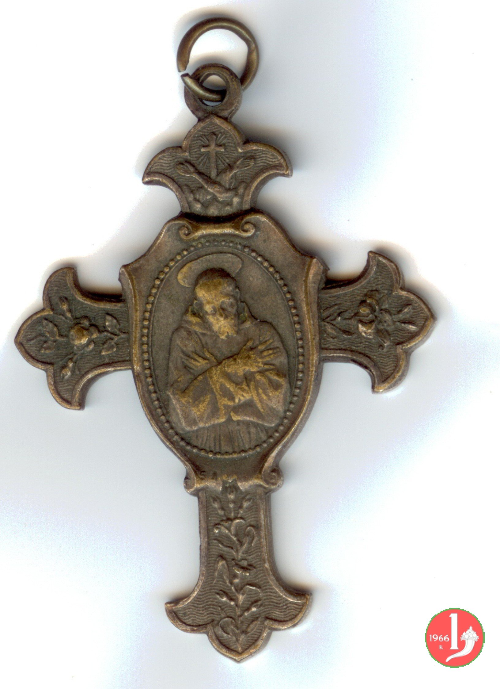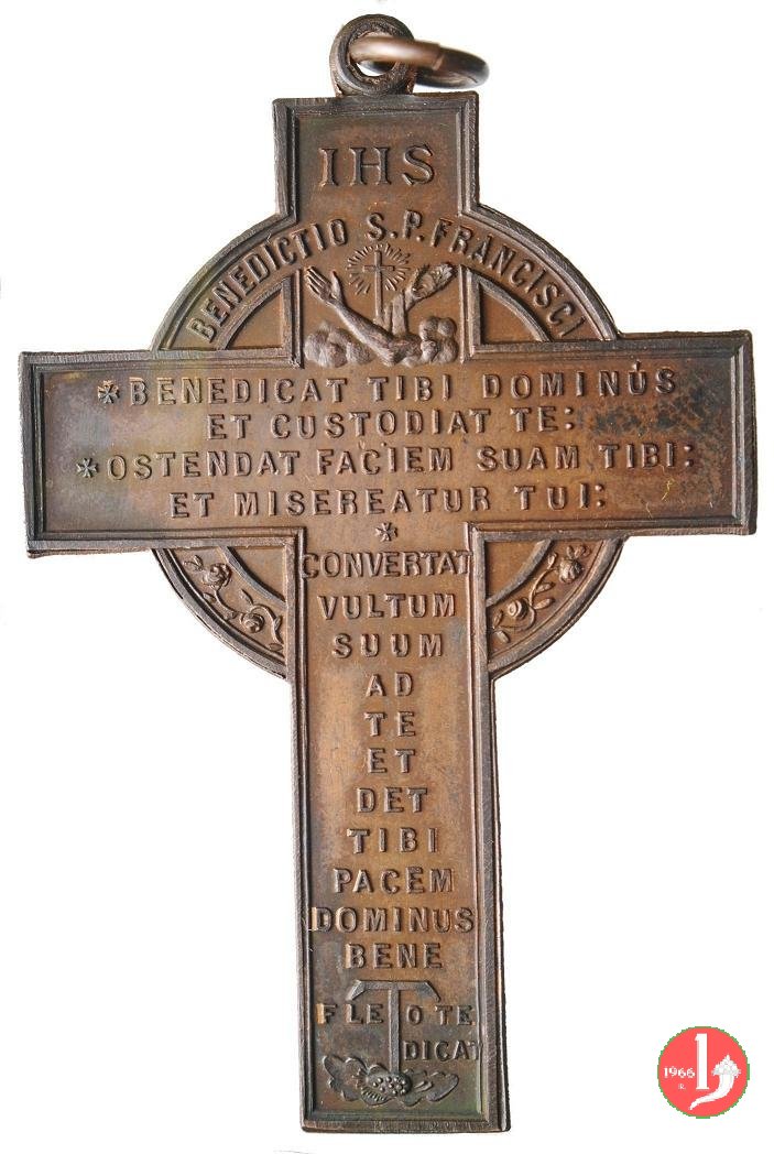 Croce con Benedizione -TAM4125 Obverse: sui bracci in alto: logo del Terzo Ordine Francescano Croce su braccia decussate ai lati: steli di gigli e di rose nel cartiglio al centro, entro ovale perlinato: busto di San Francesco nimbato di fronte con saio e braccia incrociate nel cartiglio al centro la Benedizione di San Francesco a Frate Leone con Croce a Tau: Benedicat tibi Dominus et custodiat te, ostendat faciem suam tibi et misereatur tui convertat vultum suum ad te et det tibi pacem Dominus benedicat | |