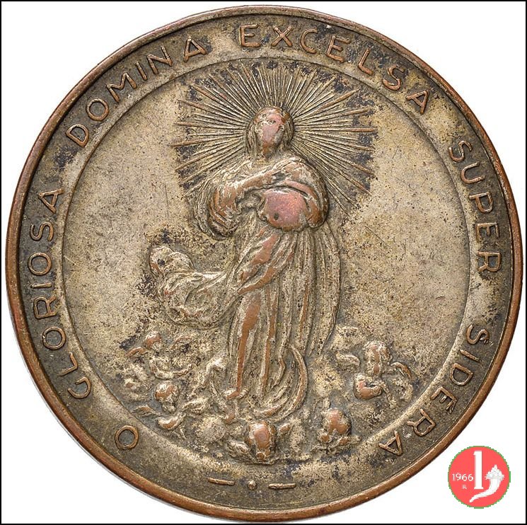 L'Immacolata 32x39mm Obverse: S. ANTONIVS PATAN. Il Santo nimbato e genuflesso verso sx venera il Bambino Gesú nimbato e benedicente su nube in esergo: ROMA La B. V., in piedi di fronte su crescente lunare e serpe con capo cinto da stelle | |