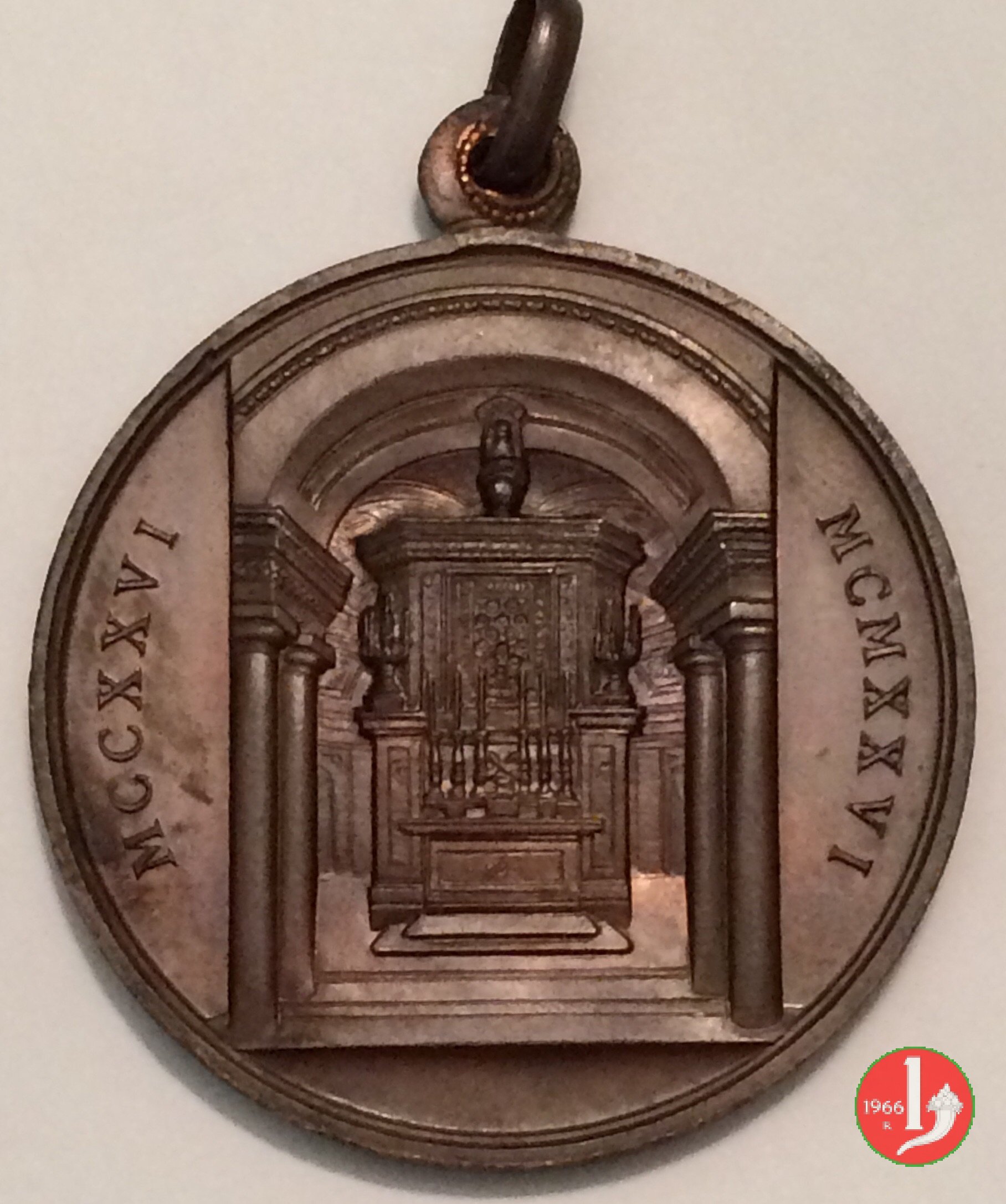 7° Centenario della morte 1926 -TAM4167 Obverse: S. FRANCISCVS _ ASSISIENSIS busto del Santo nimbato col saio a sx, volto a luce raggiante in basso, a dx: S.J. la vista dell'altare con la tomba del Santo nella Basilica inferiore di Assisi | |
