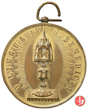 O Lingua Benedicta -TAM3577 Obverse: VERA EFFIGIE DI S. ANTONIO _ VENERATA SULLA SUA TOMBA Sant'Antonio in piedi entro edicola corinzia sotto la linea dell'esergo, a sx: S.J. in esergo: PADOVA reliquiario raggiante | |