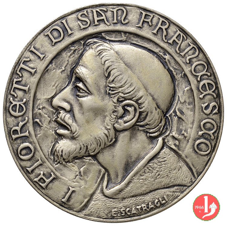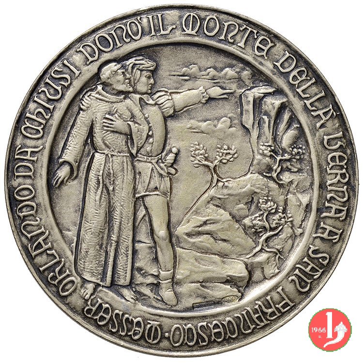 I Fioretti - Monte della Verna e Conte Orlando Chiusi Obverse: I FIORETTI DI SAN FRANCESCO busto a sx con saio sulla spalla: E. SCATRAGLI San Francesco e il Conte Orlando in piedi, volti a dx mirano il Monte della Verna | |