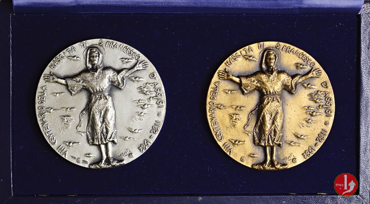800° nascita di S. Francesco 1982 Obverse: * VIII° CENTENARIO DELLA _ NASCITA DI SAN FRANCESCO _ D'ASSISI 1182 - 1982 * San Francesco in piedi di fronte con saio a braccia aperte tra volo d'uccelli in basso, a dx: A. BERTI Vista delle Basiliche Superiore e Inferiore di San Francesco in Assisi raggianti dal piazzale gremito di folla | |