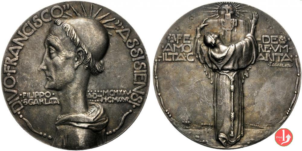 Centenario della morte 1926 Obverse: _ • • • - • • DIVO • FRANCISCO" _ "ASSISIENSI • - • • • busto di S. Francesco a sx con saio e capo raggiante nel campo, a sx: • FILIPPO • = • SGARLATA nel campo, a dx: A.D. _ MCMXXV = MCMXXVI • ai lati: * FE- _ -DEM* = • AMO _ RE. VM- = -ILTA'. C _ ARITA' • = SGALATTA | |
