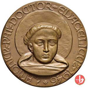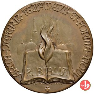 Sant'Antonio Dottore della Chiesa 1946 Obverse: S. ANTONIUS - PAT. - DOCTOR - EVANGELICUS - 1946 ✠ busto nimbato di fronte con saio Bibbia ardente aperta su cui: S. BIBLA sullo sfondo: vista della Basilica del Santo a Padova sotto alla Bibbia: BERTONI _ MILANO = ✠ | |