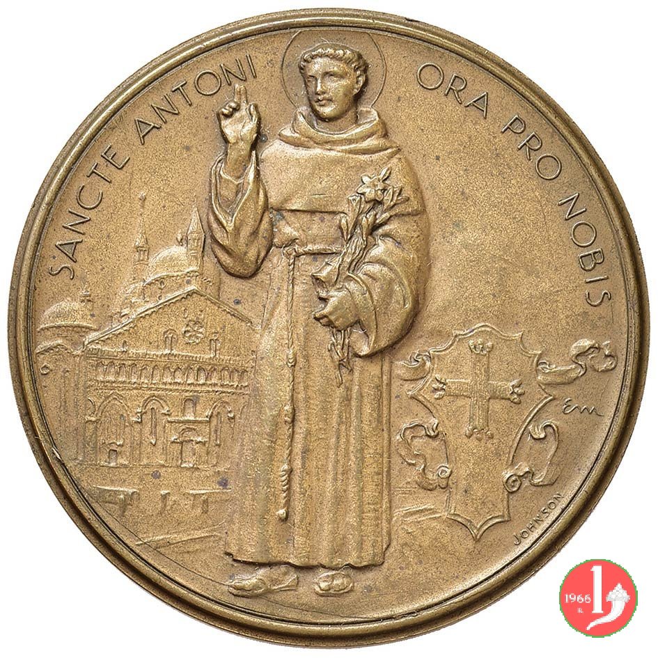 700° della Morte 1931 Obverse: S. ANTONIVS _ PATAVINVS il Santo nimbato e benedicente, in piedi, con saio, regge stelo di gigli sullo sfondo: la Basilica di Sant'Antonio a Padova e lo Stemma della Città in basso a dx: JOHNSON in basso: JOHNSON | |