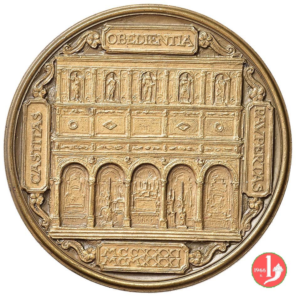 700° della Morte 1931 Obverse: SANCTE ANTONI _ ORA PRO NOBIS Il santo nimbato, in piedi, benedicente con saio regge stelo di gigli a sx: vista della Basilica del Santo a Padova a dx: Stemma con Croce tra nastri a dx: EM in basso, a dx: JOHNSON ai lati, entro riquadri: CASTITAS _ OBEDIENTIA _ PAVPERTAS in basso, entro riquadro: MCCXXXI = MCMXXXI | |