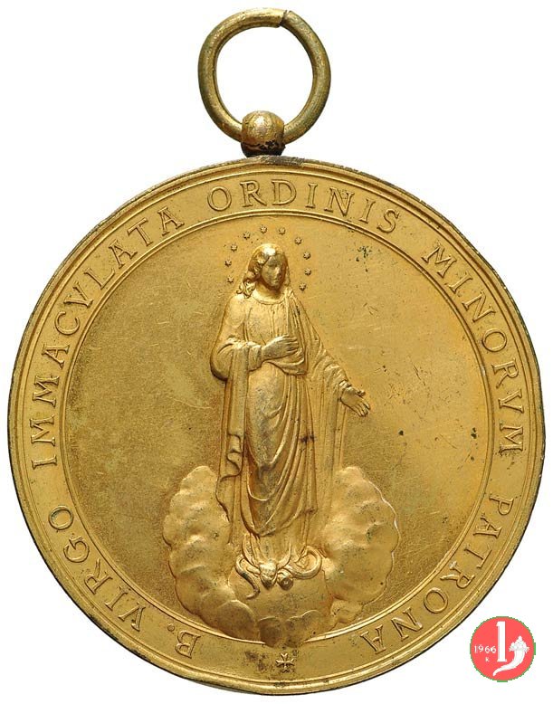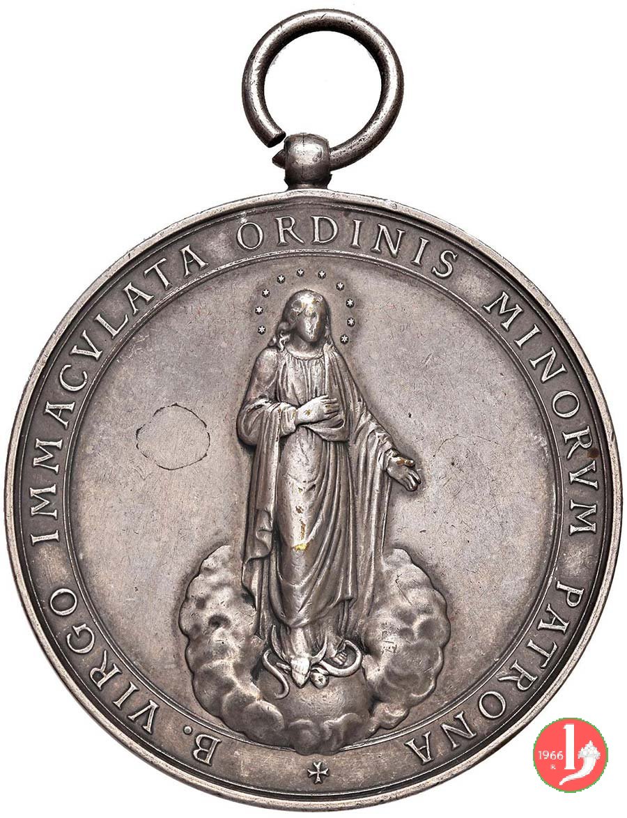 700° Ann. di Fondazione Terzo Ordine 1909 Obverse: SEPTIMO EXEVNTE SAECVLO A FVNDATIONE ORDINIS MINORVM MCMIX. = * S. FRANCISCVS * entro cornice quadrilobata e perlinata: il Santo nimbato, orante presso Croce e treschio La B. V. Maria Immacolata, in piedi su globo tra nubi, volta di 3/4 a dx, con capo avvolto da dodici stelle | |
