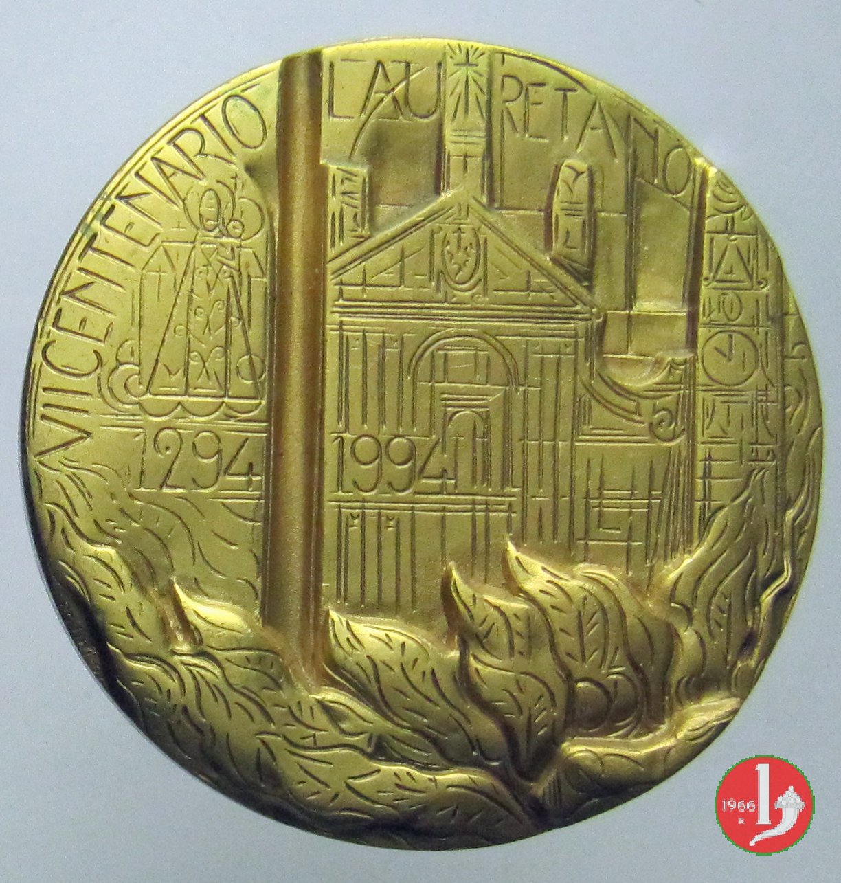 700° Lauretano 1994 Obverse: la B. V. Maria Lauretana in piedi di fronte regge Bambino; sullo sfondo la Santa Casa con a dx: S. CASA in basso, a sx: BODINI in basso, a dx: 1994 Prospetto anteriore della Basilica-Santuario di Loreto e a sx la B. V. Maria Lauretana in piedi di fronte regge Bambino sulla Santa Casa nel campo: 1294 _ 1994 | |
