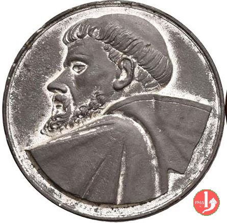 600° S. Caterina e S. Bernardino 1980 Obverse: Gesú Cristo nimbato, in piedi, di fronte, con mani incrociate sul petto e tra due Angeli e con ai suoi piedi genuflessi Santa Caterina e San Bernardino genuflessi a sx, presso il bordo: B. BURACCHINI nel campo: SESTO CENTENARIO = DELLA MORTE DI = S. CATERINA DA SIENA = E DELLA NASCITA DI S. BERNARDINO DA SIENA = 1380-1980 | |