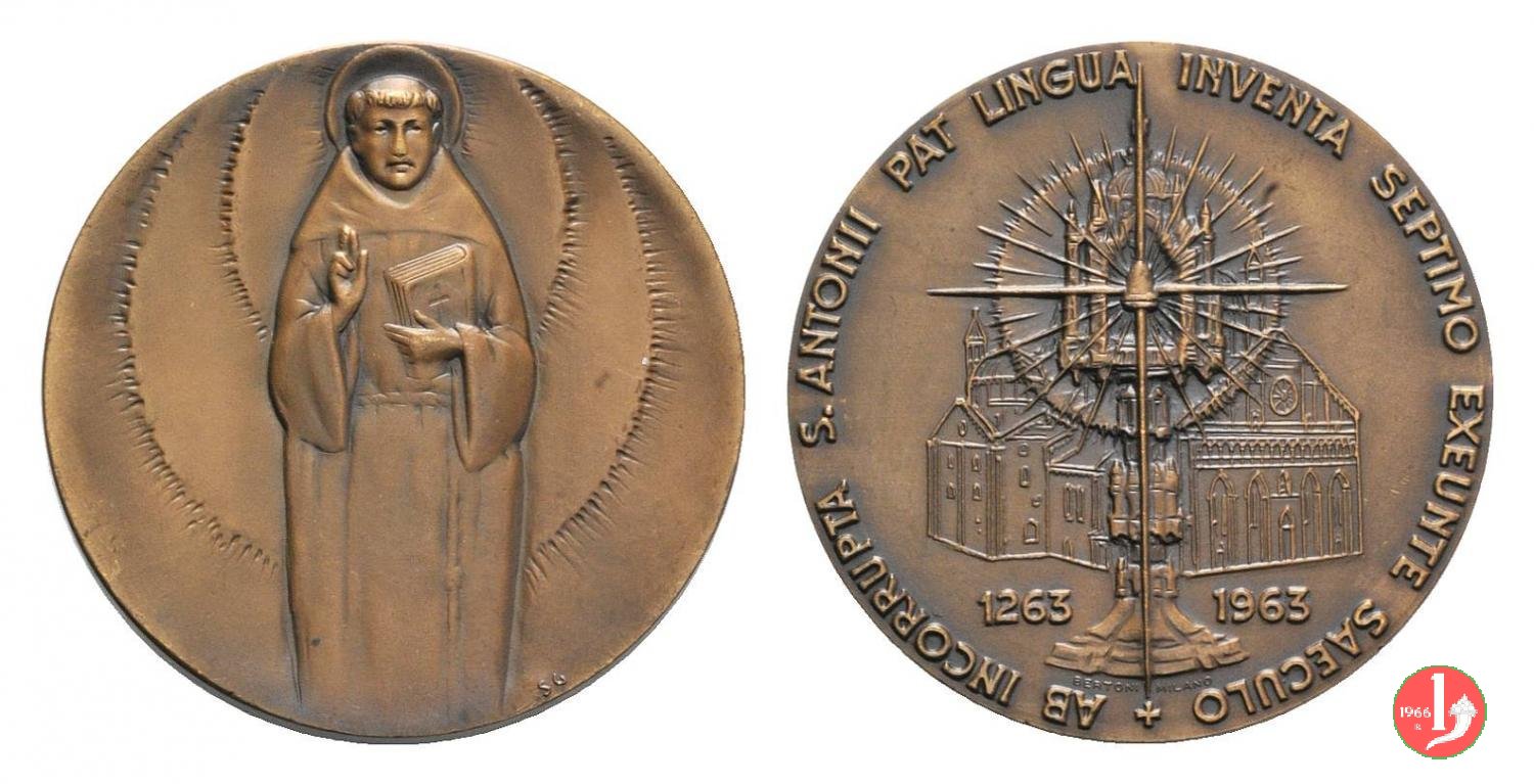 700° Ritrovamento Lingua di Sant'Antonio 1963 Obverse: mezza figura di fronte del Santo benedicente e nimbato, regge Vangelo in basso a dx: SG reliquario della Santa Lingua raggiante sulla vista della Basilica del Santo sotto, ai lati: 1263 _ 1963 in basso: BERTONI _ MILANO | |