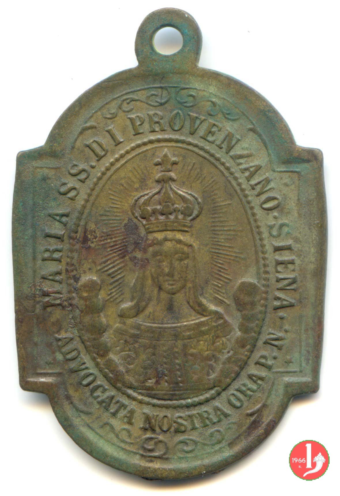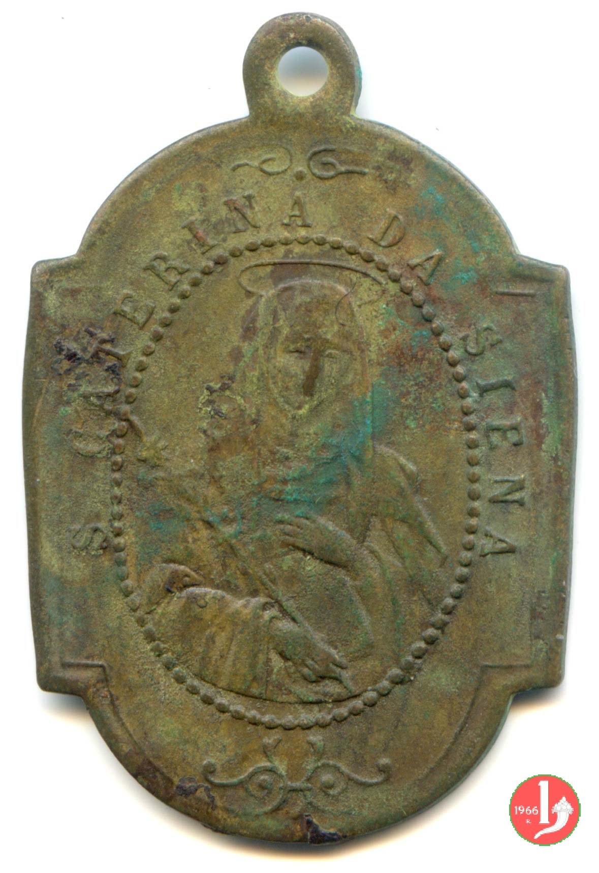 Caterina e B. V. di Provenzano Obverse: entro cornice bilobata ornata da volute: S. CATERINA DA SIENA entro ovale perlinato: busto della Santa velato e nimbato, regge stelo di gigli entro ovale perlinato: busto della B. V. Maria coronato e raggiante di fronte | |