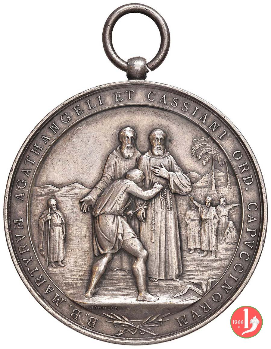 Beatificazione Cassiano da Nantes e Agatangelo da Vendôme 1905 Obverse: B. B. MARTYRVM AGATHANGELI ET CASSIANI ORD. CAPVCCINORVM (rami di palma decussati) Scena del martirio dei due Frati in esergo: JOHNSON La B. V. Maria Immacolata, in piedi su globo tra nubi, volta di 3/4 a dx, con capo avvolto da dodici stelle | |