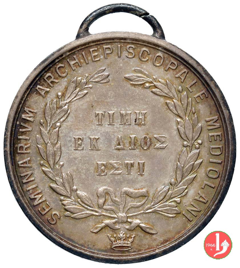 Seminario di Milano 34mm Obverse: NORMA CLERI SPES GREGIS • busto a sx con berretto e mozzetta entro rami d'alloro, legati in basso da nastro: TIMH = EK ΔIOΣ = EΣTI | |