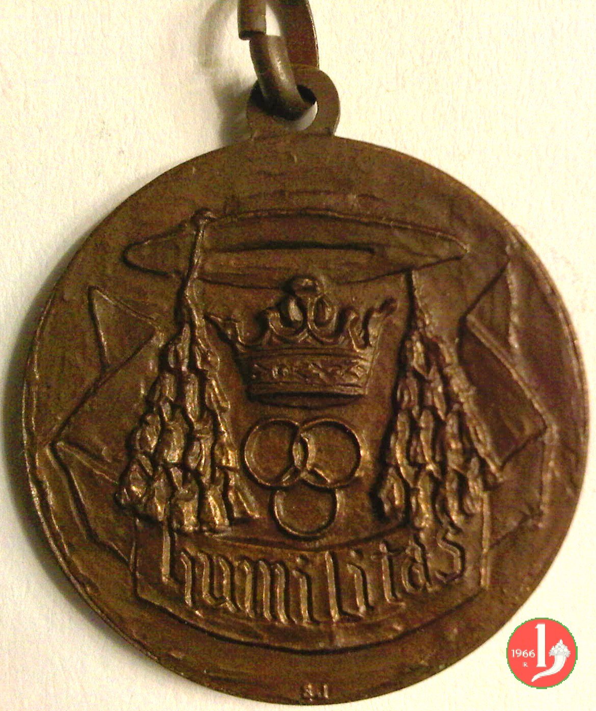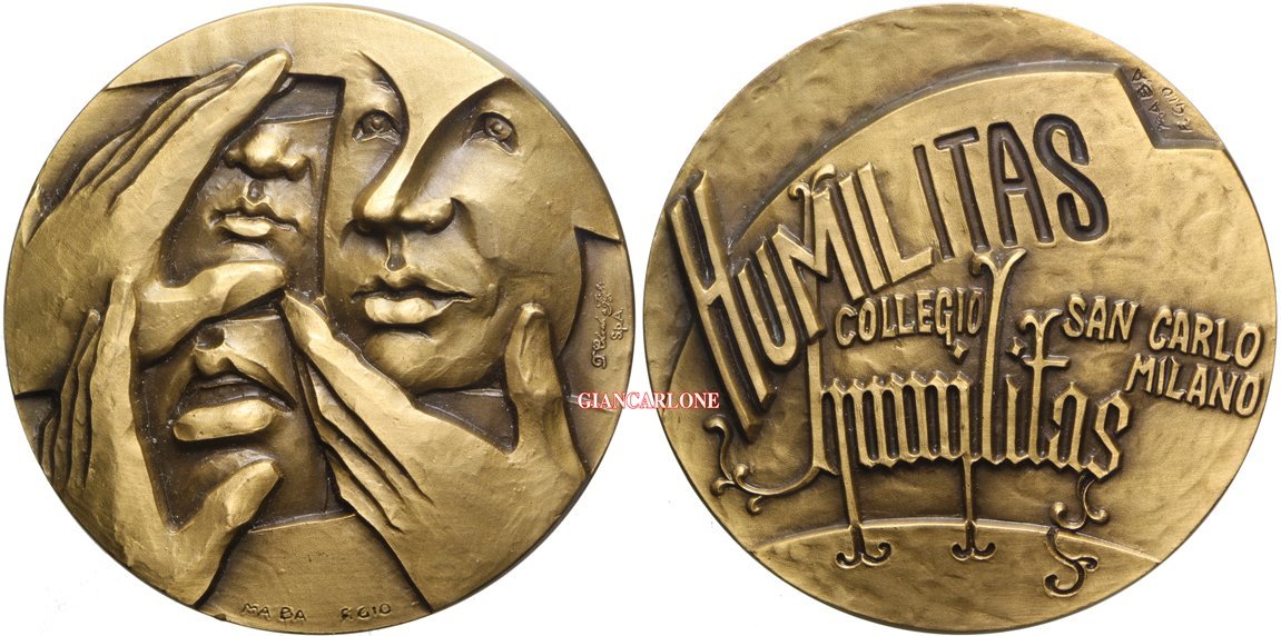 Collegio San Carlo Borromeo di Milano 60mm Obverse: Tre volti con tre mani in basso: MA BA _ F. GIO a dx presso il bordo: D. COLOMBO & F. = S.P.A sotto ripetuto in gotico: HUMILITAS in alto a dx presso il bordo: MA BA = F. GIO | |