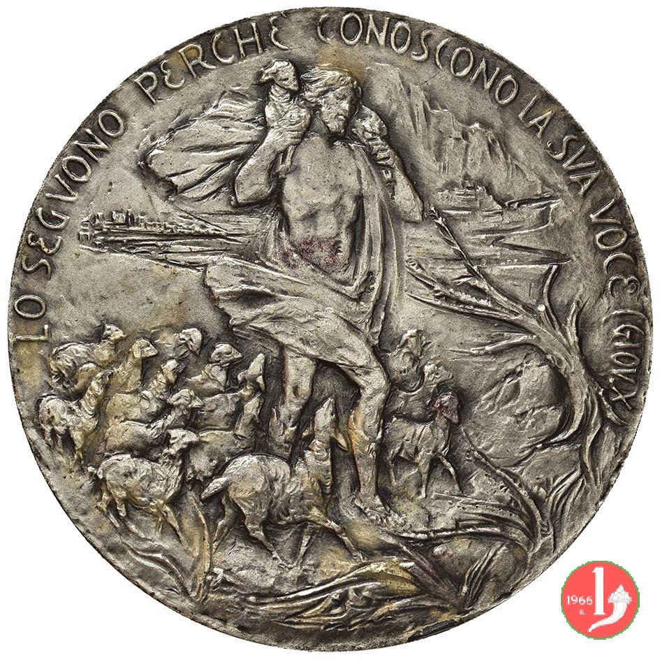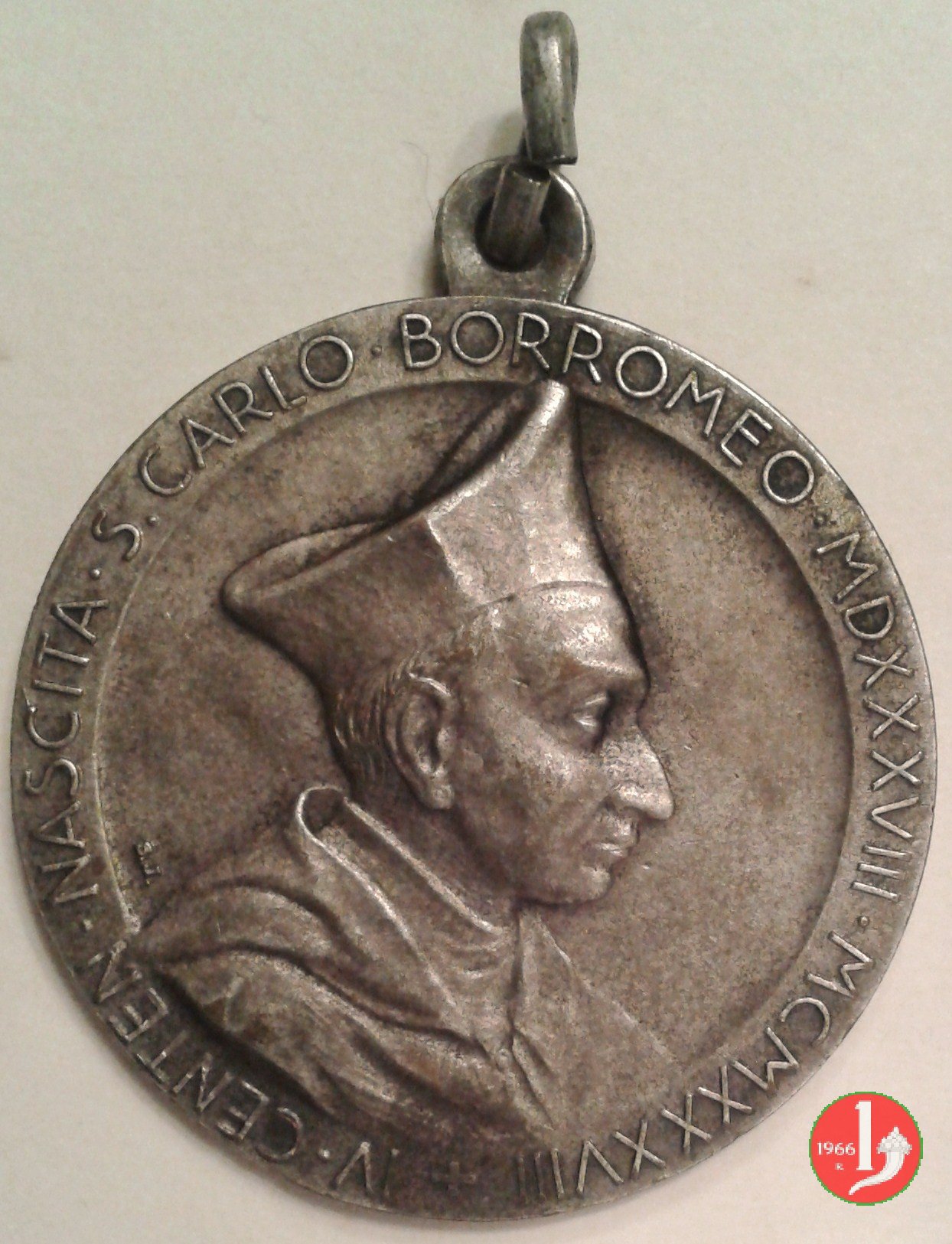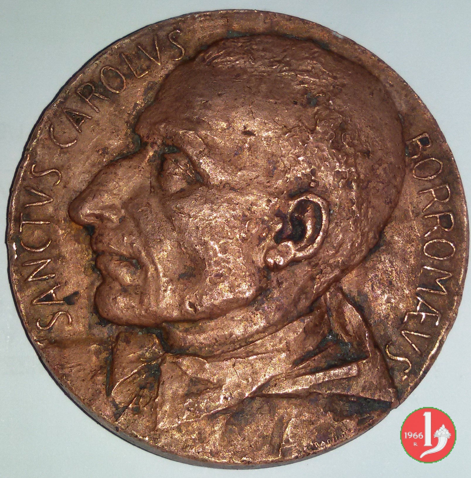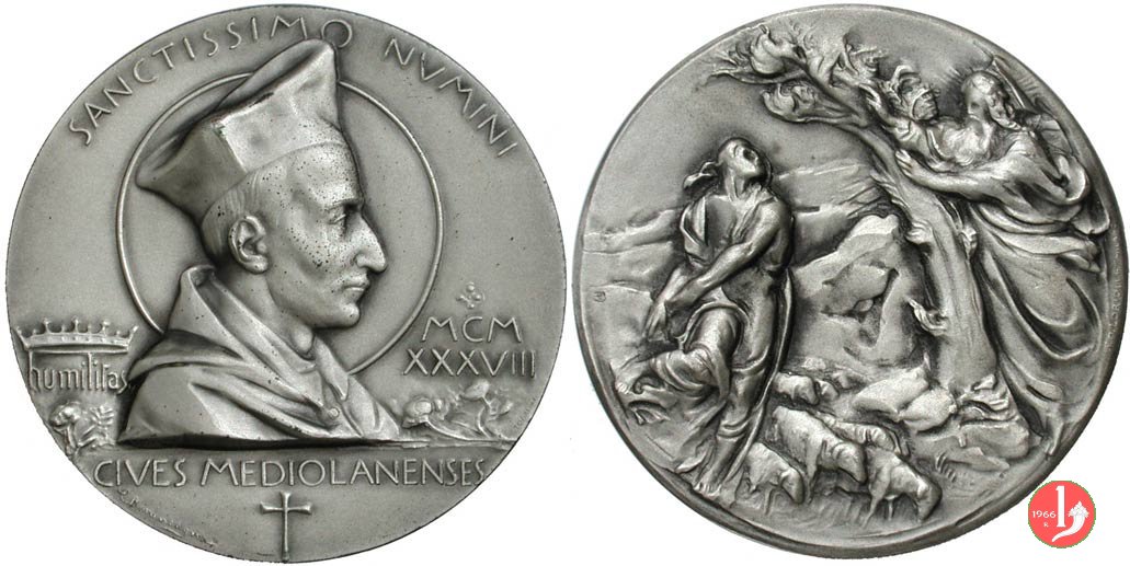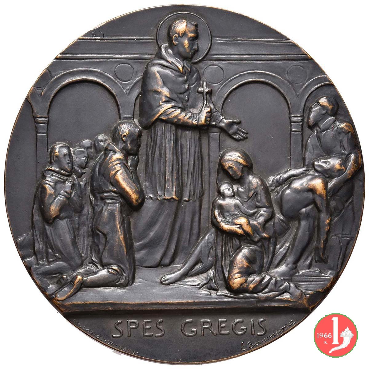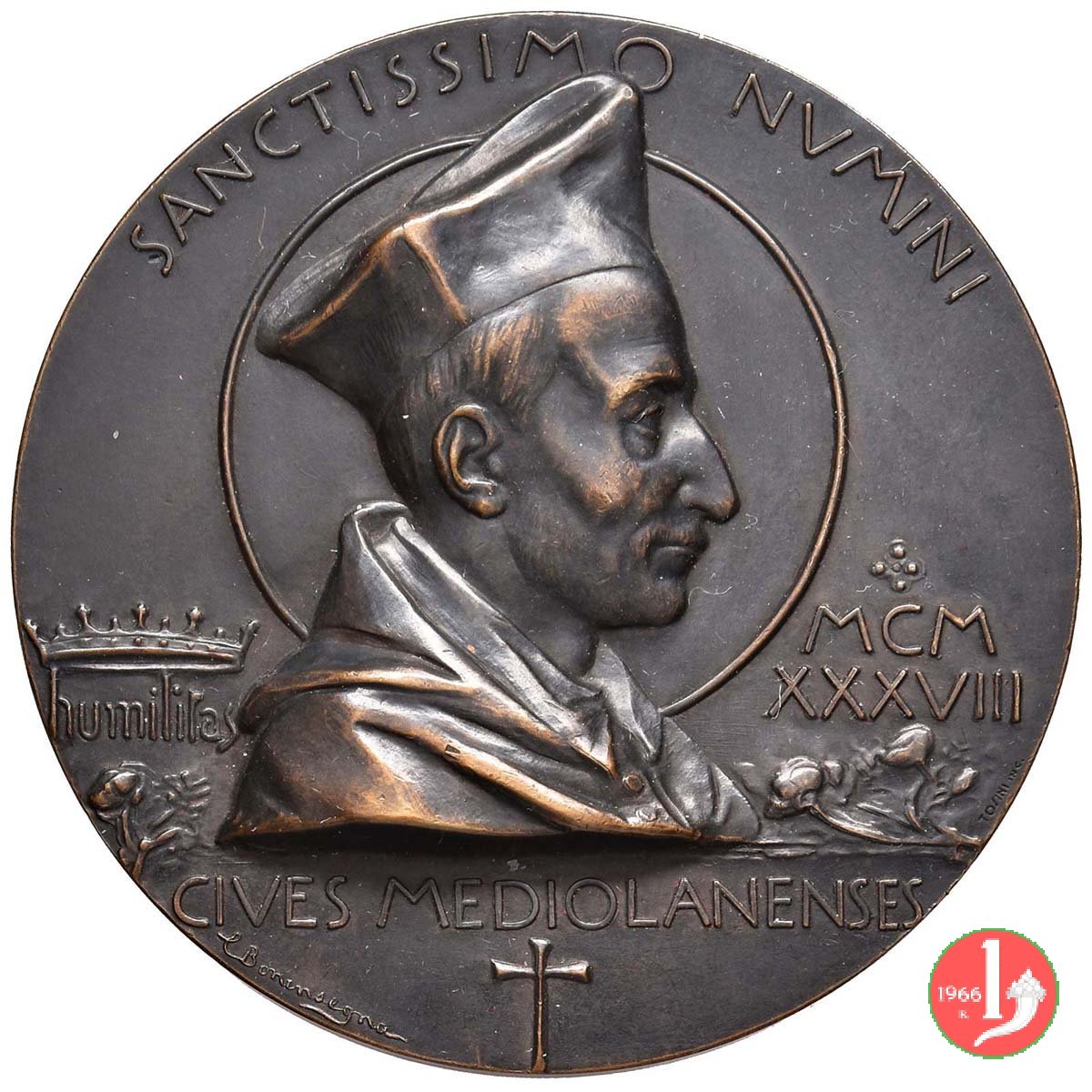 400° Nascita - Sanctissimo Nvmini 1938 Obverse: SANCTISSIMO NVMINI busto nimbato a dx con berretto e mozzetta tra rose nel campo, a sx: HUMILITAS (coronato) nel campo, a dx: MCM = XXXVIII a dx presso il bordo: TOSINI INC. in esergo: CIVES MEDIOLANENSES = ✠ in basso, a sx, corsivo: E. BONINSEGNA in esergo: SPES GREGIS in esergo, presso il bordo: F.M. LORIOLI • F.lli MILANO • _ E BONISEGNA | |
