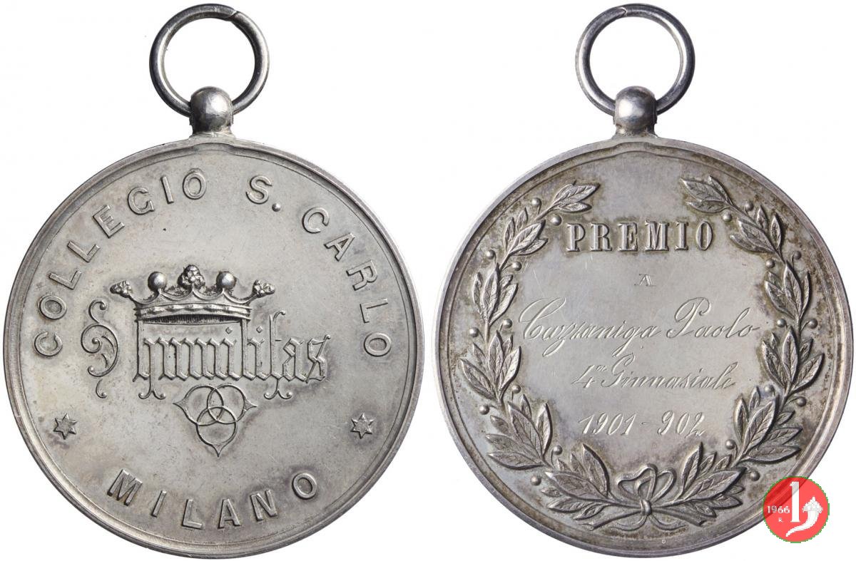 Premio Collegio San Carlo di Milano Obverse: COLLEGIO S. CARLO = * MILANO * nel campo: HUMILITAS coronata con fregio a sx e sopra tre anelli intrecciati | |