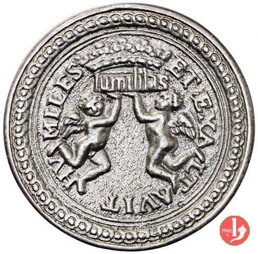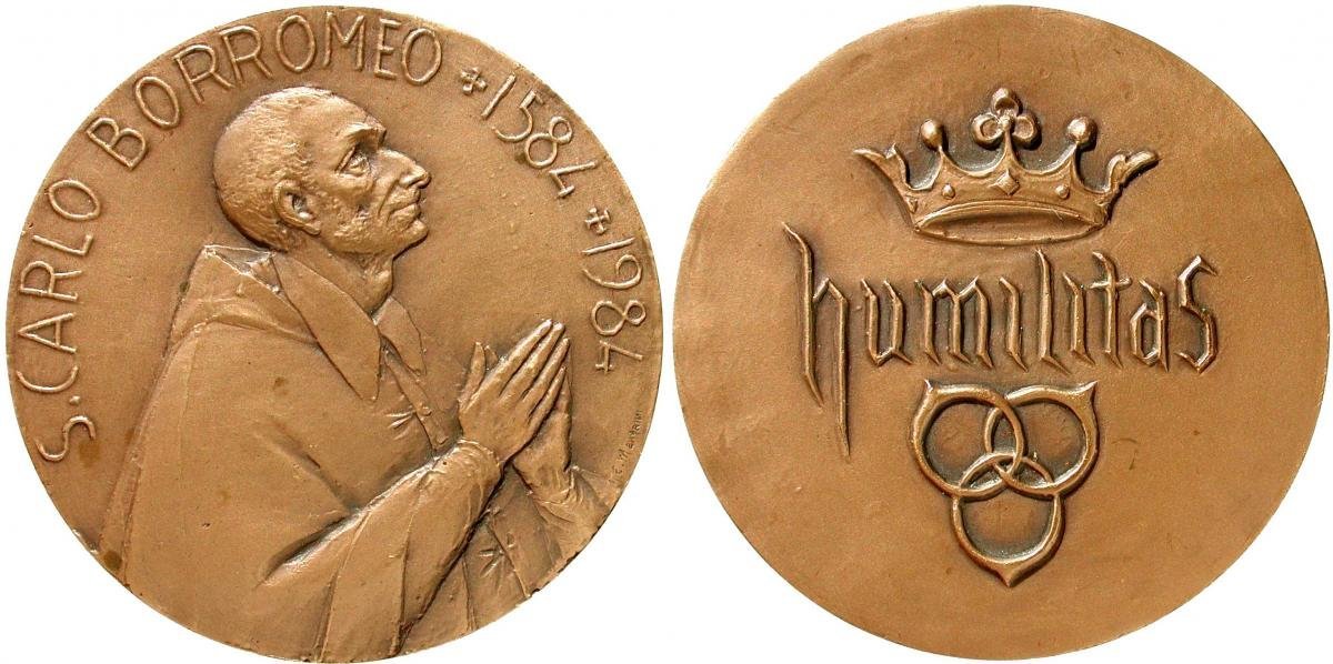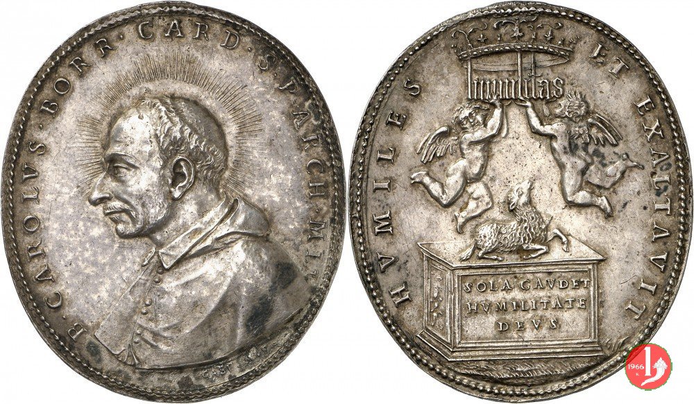 Beatificazione - Agnello su altare e Angeli con Insegne Obverse: B • CAROLVS • BORR • CARD • S • PARCH • MIL busto raggiante a sx con mozzetta sotto: GASP. M • F • Due Angeli sorreggono insegna HVMILITAS e corona sopra ad Agnello posto su altare contenente la legenda: SOLA CAVDET = HVMILITATE = DEVS | |