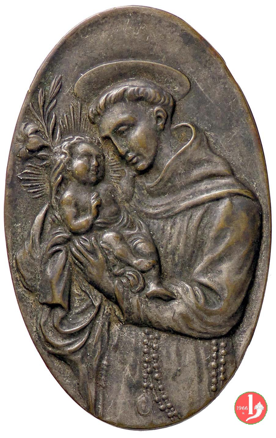 Uniface ovale 37x59mm Obverse: mezzo busto di Sant'Antonio nimbato volto a sx, con saio e corona del Rosario, regge il Bambino Gesú con capo raggiante su stelo di gigli Reverse: - | |