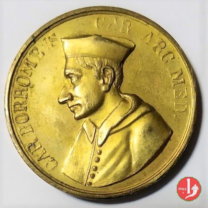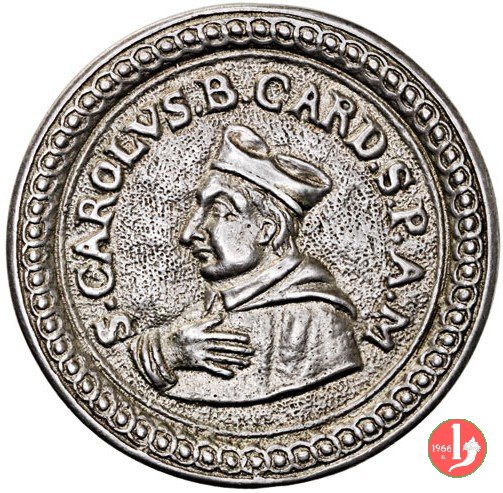 San Carlo Borromeo e Sacra Famiglia Obverse: S. CAROLUS _ BORROMEUS busto nimbato a sx con mozzetta e mantello, è rivolto verso luminescenza entro contorno circolare continuo: Sacra Famiglia con San Giovannino, Sant'Elisabetta e angeli (tratta dal dipinto di Raffaello - Sacra Famiglia di Francesco I, conservata al Louvre) | |