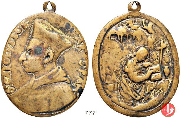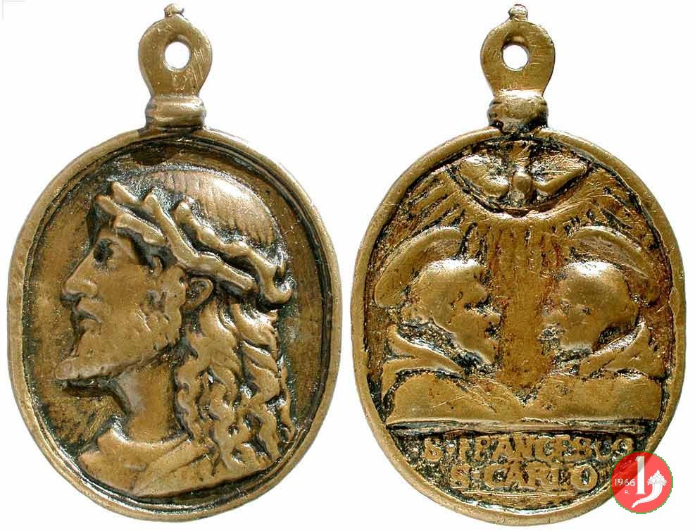 Ovale con Cristo e San Francesco Obverse: busto di Cristo a sx coronato da spine Reverse: colomba dello Spirito Santo raggiante sui busti affrontati di San Francesco e San Carlo Borromeo in esergo: S. FRANCESCO = S. CARLO | |