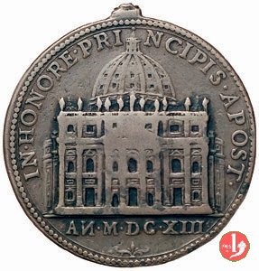 Basilica di San Pietro 1613 Obverse: S • CAROLVS • BORR • CARD • S • P • AR • ME • busto nimbato a dx con berretto e mozzetta sotto: A • MORI Prospetto anteriore della Basilica Vaticana in esergo: AN • M • DC • XIII • | |