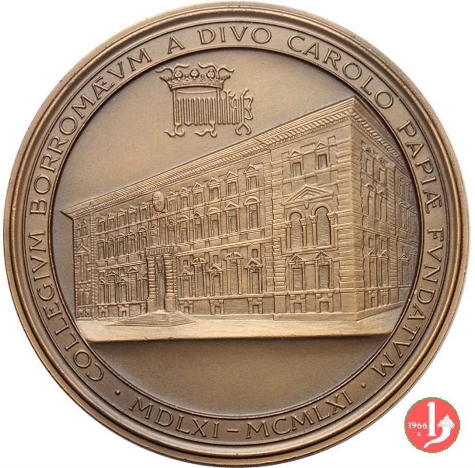 Collegio Borromeo Pavia al Rettore 1961 Obverse: SANCTVS CAROLVS BORROMAEVS CARDINALIS MEDIOLANENSIS * busto a sx con cappello sul taglio spalla: A. FIGINI P. CA INC. in basso, a dx: S. JOHNSON Vista del Collegio Borromeo sormontato da UMILITAS coronato | |