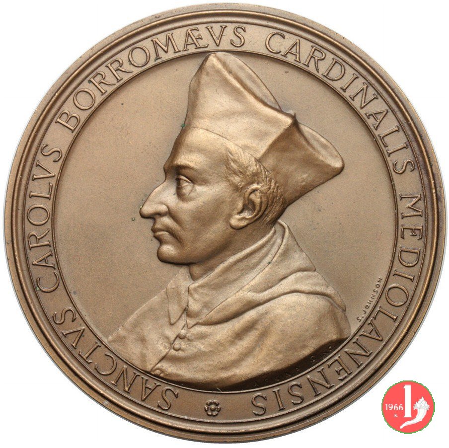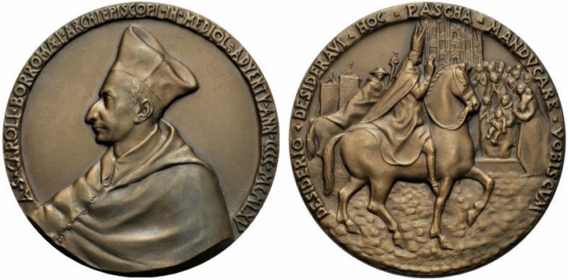 Ingresso a Milano di Carlo Borromeo 1965 Obverse: A • S • CAROLI • BORROMAEI • ARCHIEPISCOPI • IN • MEDIOL • ADVENTV • A • CCCC • MCMLXV busto a sx con berretto e mozzetta in basso, a dx: S. JOHNSON sul taglio spalla: E. TESTA = MCMLXV L'ingesso a Milano del Cardinal Carlo Borromeo, a cavallo, verso dx, benedicente, con mitra e mantello; sullo sfondo il Duomo di Milano e folla orante | |