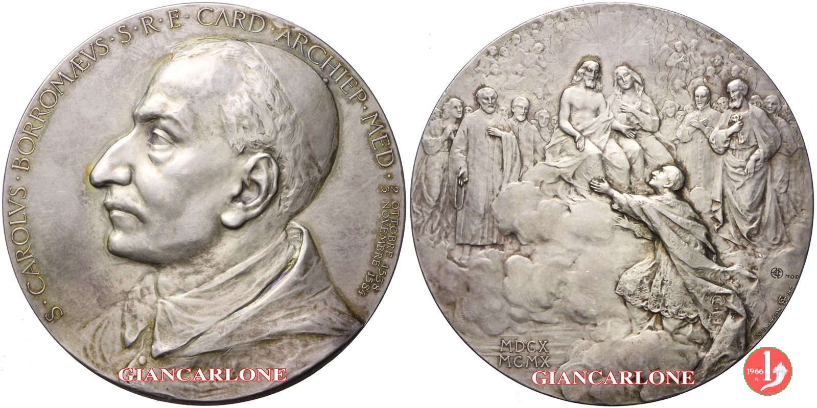 300° Canonizzazione 39mm 1910 Obverse: S. CAROLVS • BORROMAEVS • S • R • E • CARD • ARCHIEP • MED • busto a sx con mozzetta a dx, su due righe: 2 OTT. 1538 = 3 NOV. 1584 a dx: San Pietro in piedi regge chiavi in basso a sx: MDCX = MCMX in basso, a dx: S. J. | |