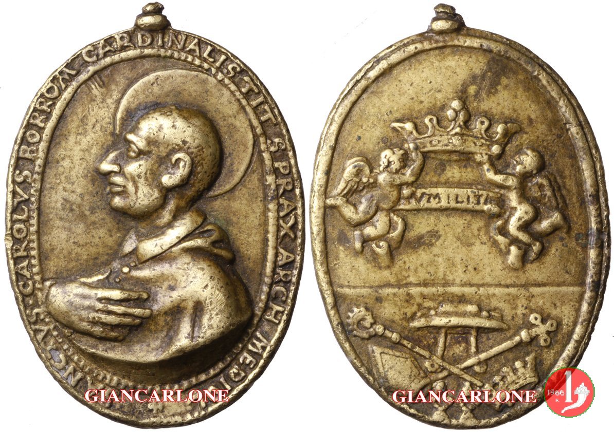 Angeli con corona 66x50mm Obverse: SANCTVS • CAROLVS • BORROM • CARDINALIS • TIT • S •PRAX • ARCH • MEDIOL • busto nimbato a sx con mozzetta in esergo: galero su pastorali decussati, corona e mitra | |