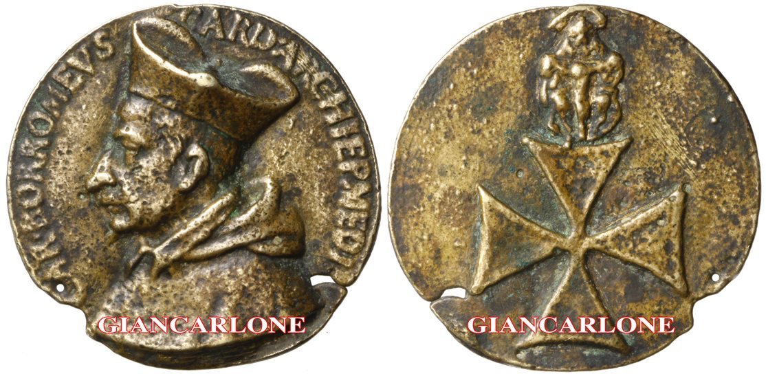 Croce di Malta 47mm Obverse: CAR BORROMEVS _ CARD ARCHIEP MEDI busto a sx con berretto e mozzetta | |