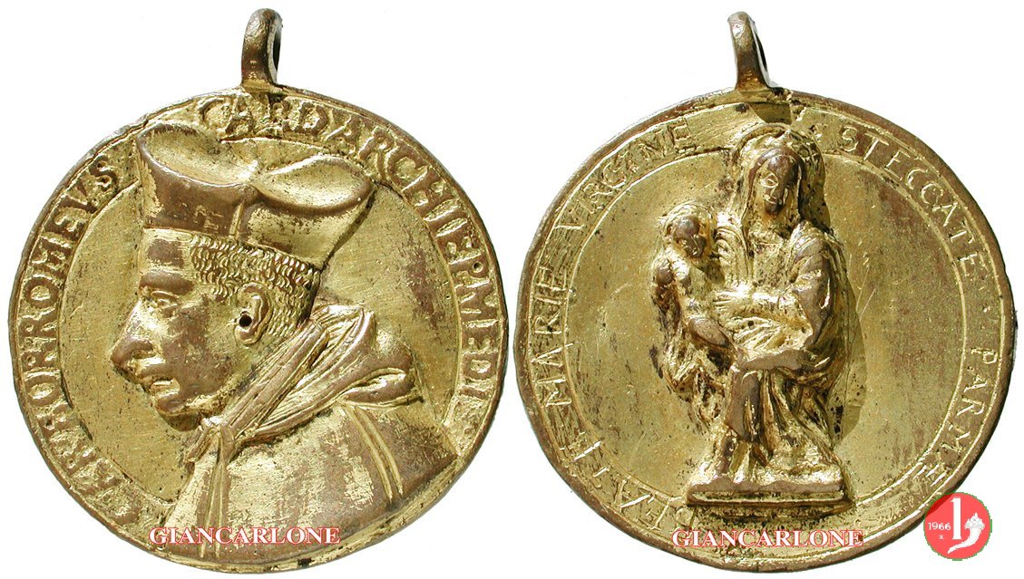 Santa Maria della Steccata - Parma Obverse: CAR BORROMEVS _ CARD ARCHIEP MEDI busto a sx con berretto e mozzetta la B.V. in piedi di fronte | |