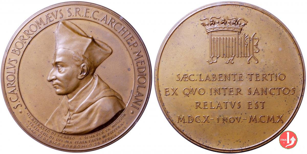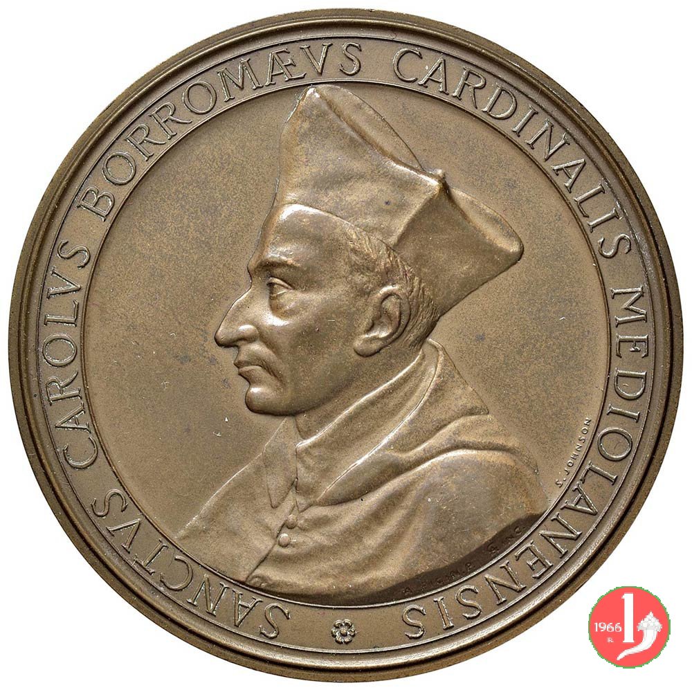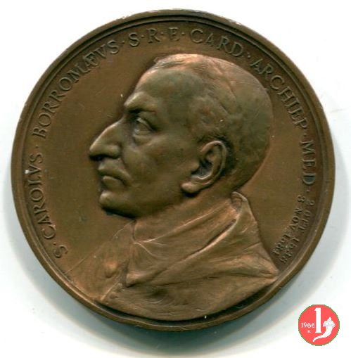 300° Canonizzazione 60mm 1910 Obverse: _ • S. CAROLVS BORROMAEVS S. R. E. C. ARCHIEP. MEDIOLANI • busto a sx con cappello e mozzetta in basso, a dx: S. JOHNSON in basso, circolarmente su tre righe: IL RITRATTO DI S. CARLO. •E SI HA PER LA MIGLIOR = << TESTA CHE DI LVI SIA STATA FATTA IN PITTVRA >> = CARD. FEDERICO BORROMEO 28 APRILE 1618 sotto: SAEC. LABENTE TERTIO = EX QVO INTER SANCTOS = RELATVS EST = M.DC.X - I NOV. - M.CM.X | |