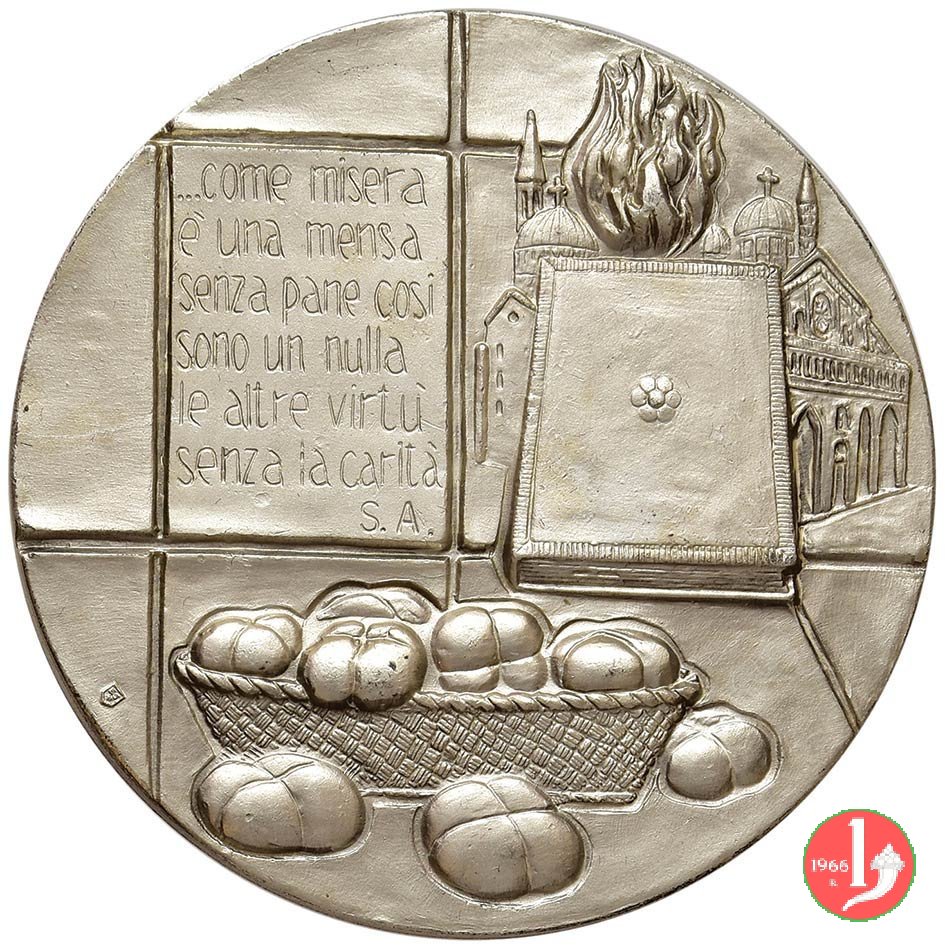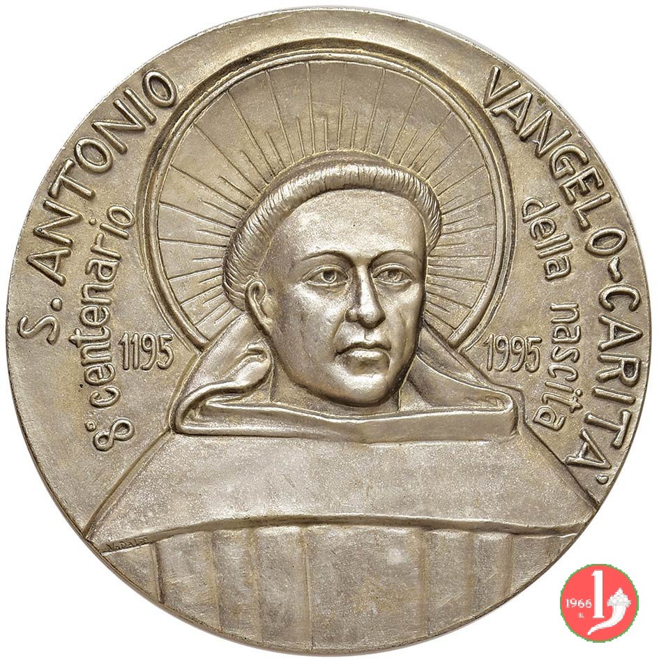 800° della Nascita 1995 Obverse: S. ANTONIO _ VANGELO-CARITA' circolarmente: 8° CENTENARIO _ DELLA NASCITA busto con nimbo raggiante di fronte e saio ai lati: 1195 _ 1995 entro targa, a sx: COME MISERA = E' UNA MENSA = SENZA PANE COME = SONO UN NULLA = LE ALTRE VIRTU' = SENZA CARITA' in basso: paniere con micche in basso a sx: logo Senesi | |