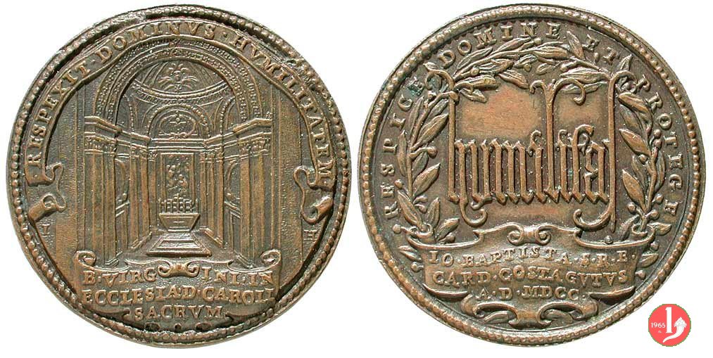 Chiesa di San Carlo alle Quattro Fontane 1700 Obverse: in alto entro nastro disposto circolarmente: • RESPEXIT • DOMINVS • HVMILITATEM • vista dell'Abside con l'altare maggiore delle Chiesa di San Carlo alle Quattro Fontane, la pala con l'immagine della B. V. sotto, in cartiglio: B • VIRGINI • IN = ECCLESIA • D • CAROLI = SACRVM ai lati, iniziali dell'incisore: I _ H nel campo entro rami d'alloro: HUMILITAS sotto in cartiglio: IO • BAPTISTA • S • R • E • = CARD • COSTAGVTVS = A • D • MDCC • | |