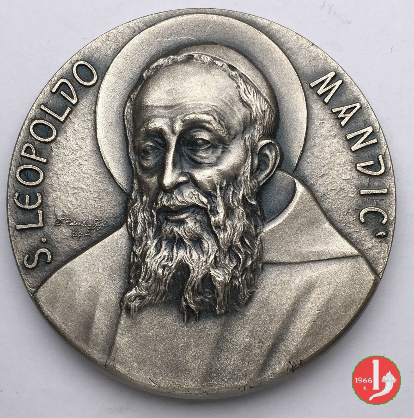 Leopoldo Mandic Dritto: LEOPOLDO _ MANDIC' busto nimbato di fronte con zucchetto e saio nel campo a sx: D. COLOMBO E FIGLI = S.P.A. Croce gemmata e radicata al suolo tra quattro stelle, due cervi e due pecore al pascolo si abbeverano alla fonte che sgorga dalle radici della Croce | |