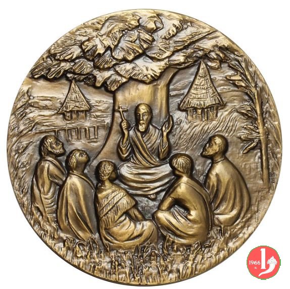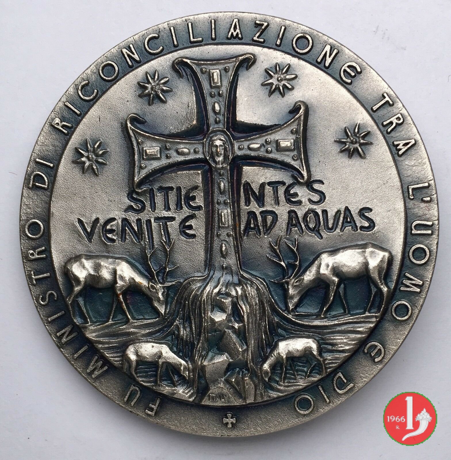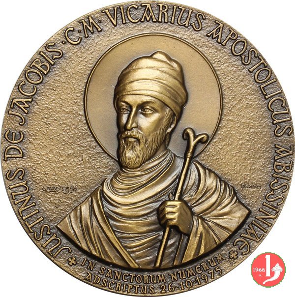 Giustino de Jacobis 1975 Dritto: ✠ JUSTINUS DE JACOBIS • C • M • VICARIUS APOSTOLICUS ABISSINIAE ✠ Busto nimbato di 3/4 a sx con turbante, tunica, mantello e pastorale nel campo ai lati: D. COLOMBO & F. _ F. MINA sotto: IN SANCTORUM NUMERU = ADSCRIPTUS 26-10-1975 | |