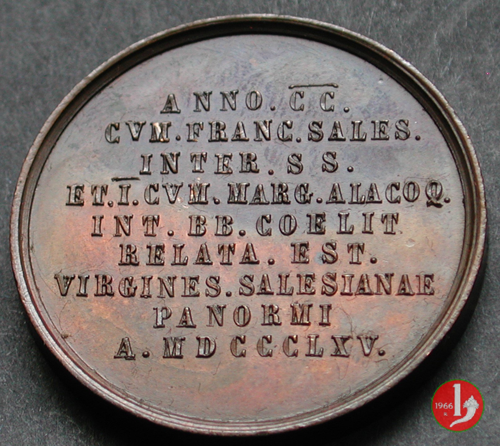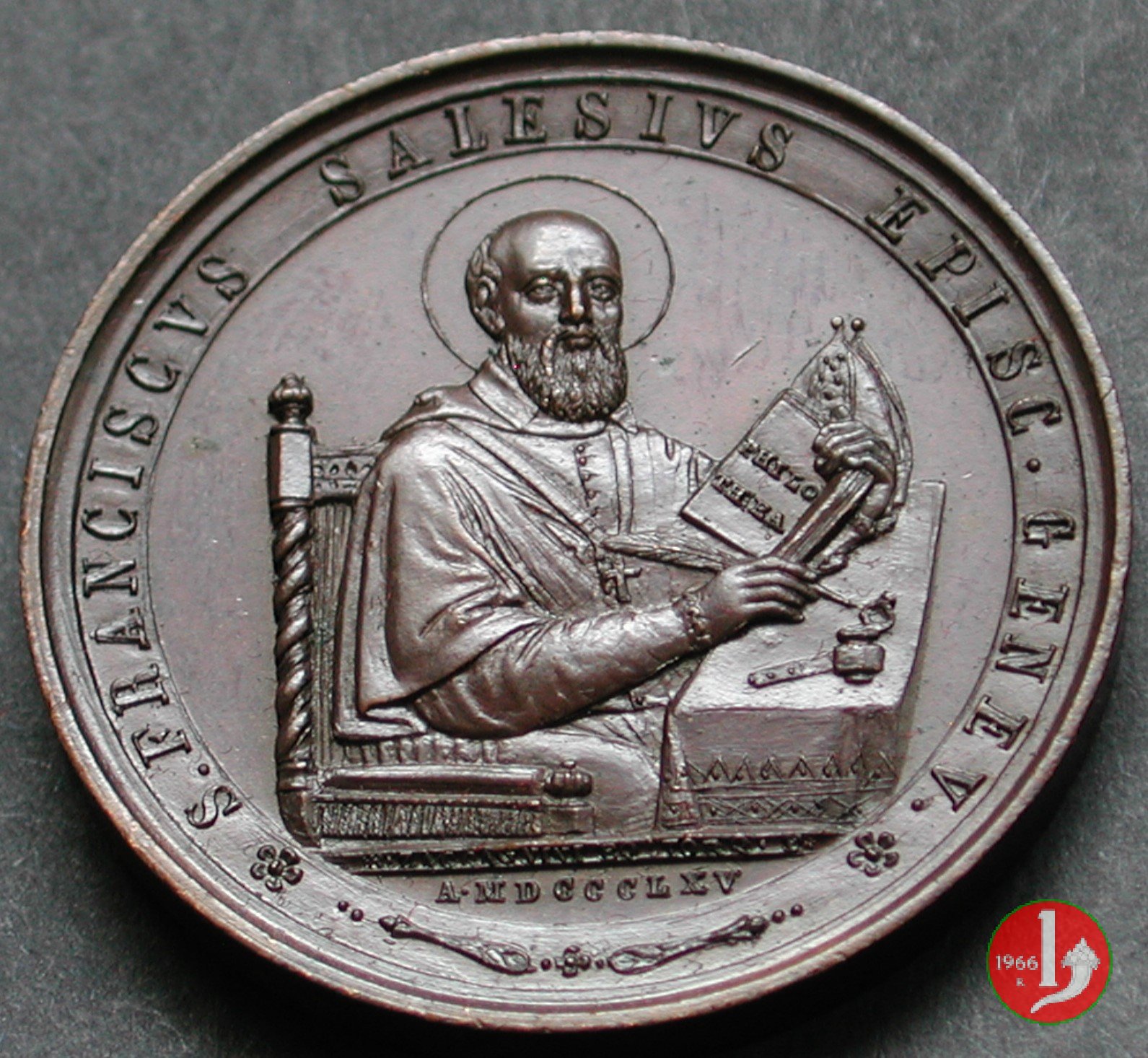 Francesco di Sales 1865 Dritto: * S.FRANCISCVS SALESIVS EPISC. GENEV. * (fregio) busto seduto e nimbato di fronte con abito talare e Croce pettorale, regge tomo PHILO = PHIHA e intinge penna in calamaio sul taglio dell'immagine: ZACCAGNINI BONFILIVS F. in esergo: A • MDCCCLXV | |