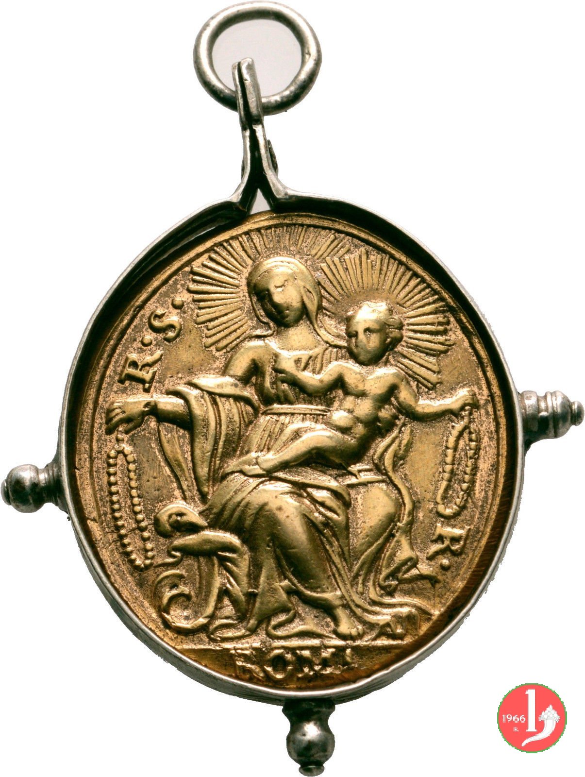 Dominikus Guzmán - Regina del Santo Rosario Dritto: SANCTE _ DOMINIC busto nimbato a dx con saio, regge stelo di gigli e Vangelo aperto La B. V. Maria seduta di fronte velata e con volto raggiante regge corona del Rosario e il Bambino Gesú con corona in esergo: ROMA | |