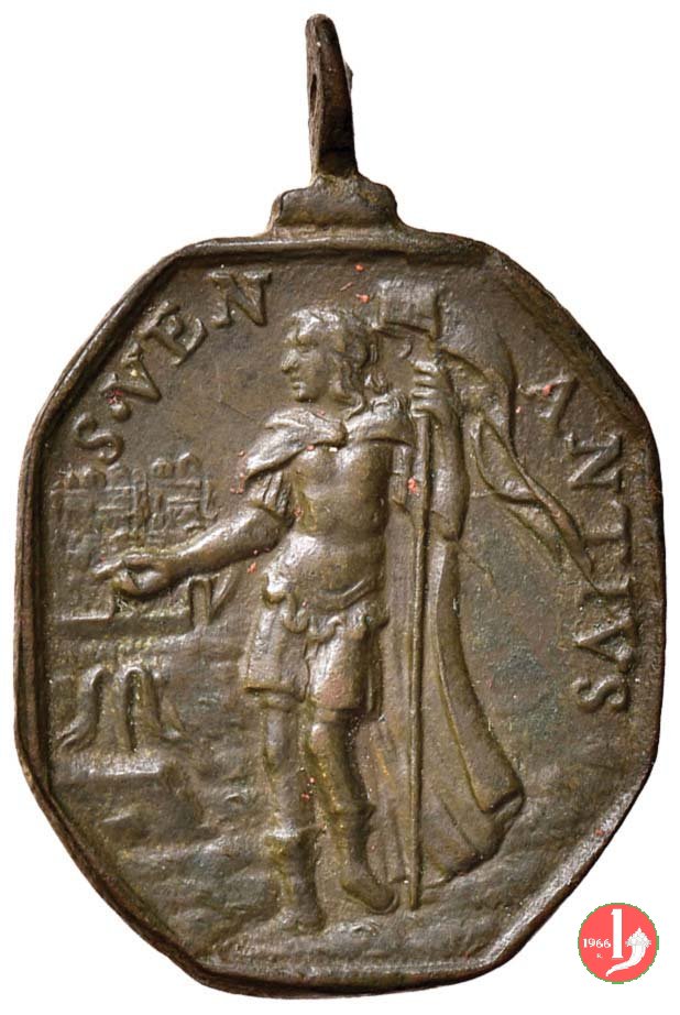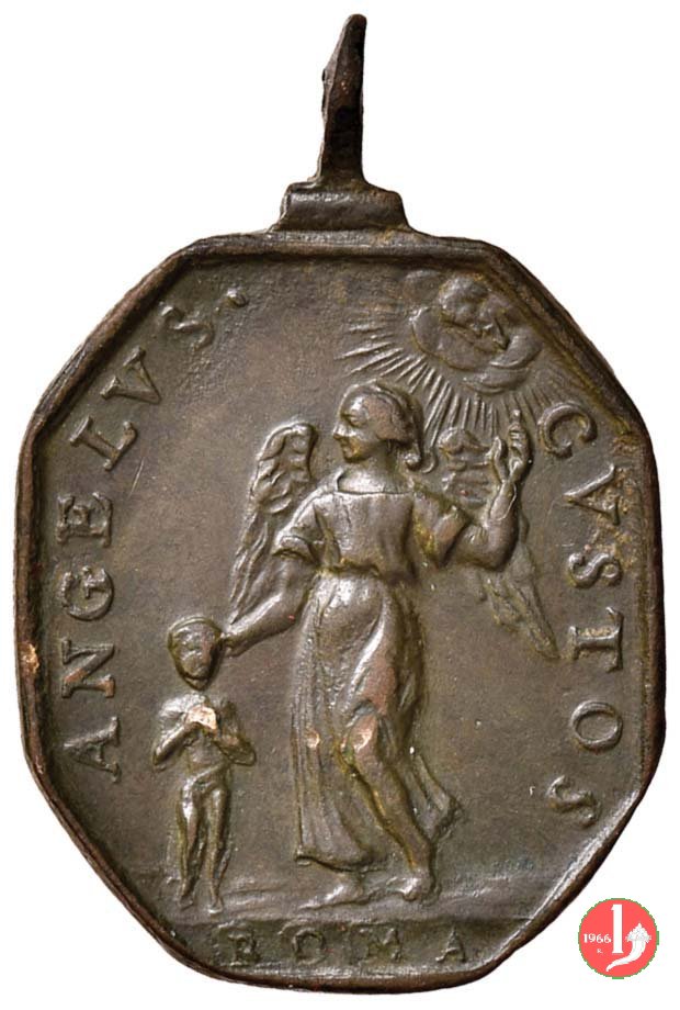 Venanzio e Angelo Custode Dritto: S • VEN _ ANTIVS il Santo in piedi paludato e con stendardo mira porto a sx Angelo custode volto a sx conduce fanciullo in alto a dx: nube raggiante con triangolo in esergo: ROMA | |