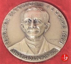 Léon Dehon - 100° Sacerdoti del Sacro Cuore di Gesú 1988 Dritto: FONDATOR SACEDOTORUM A S. CORDE JESU busto di fronte con abito talare e cappotto nel campo a dx: D. COLOMBO & FIGLI = S.P.A. sotto: 1843 P. LEO J. DEHON 1925 logo della Congregazione tra le date 25 11 = 1888 e 25 11 = 1988 sotto entro nastro: ADVENIAT REGNVM TVVM sotto circolarmente: DECRETUM LAUDIS | |
