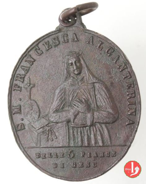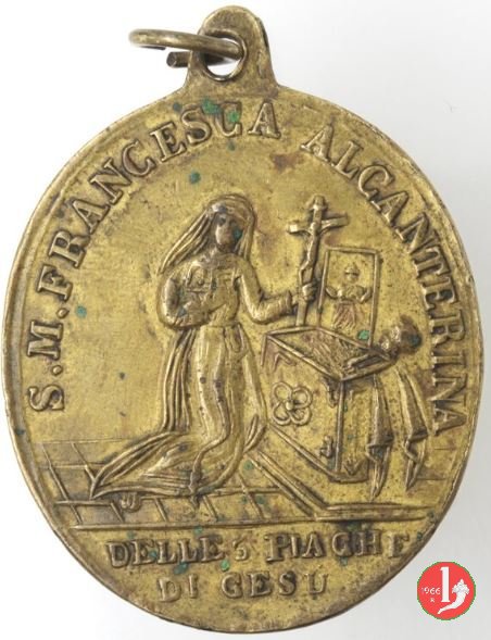 Gennaro - Francesca Alcanterina Dritto: SAN. GENNARO NOSTRO PROTETTORE busto di fonte con mitra, Croce pettorale e piviale, a dx le due ampolle busto velato di fronte con saio e mani conserte; a sx tavolo con Croce, ovale e corona del Rosario in esergo: DELLE 5 PIAGHE = DI GESU' | |