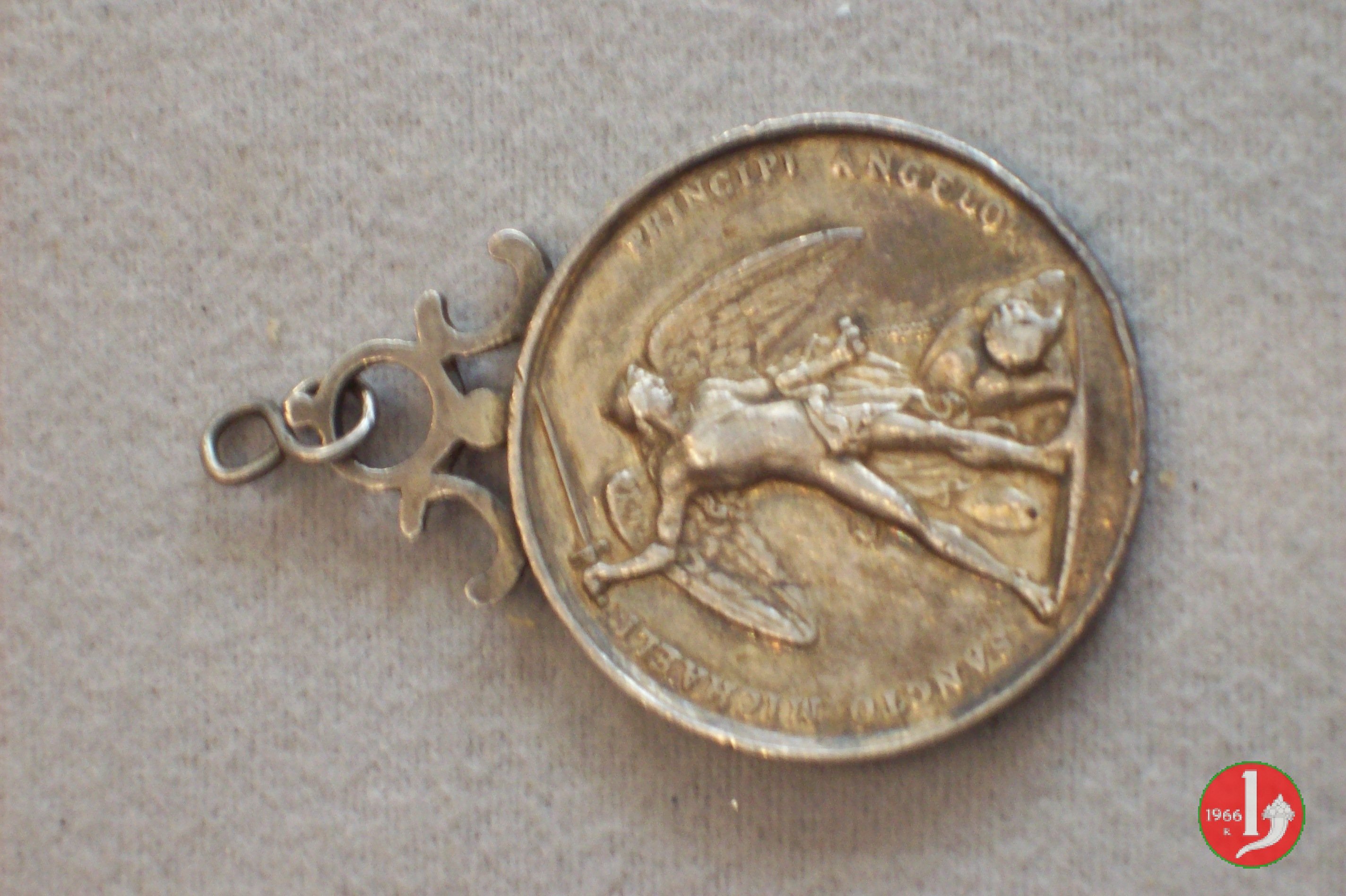 Michele Arcangelo Dritto: SANCTO MICHAELI _ PRINCIPI ANGELOR • San Michele Arcangelo in piedi, ad ali spiegate, regge spada e tiene in catene demone genuflesso di fronte in esergo, ai lati: G. FINELLI = INV. _ G. CERBARA = FECIT | |